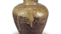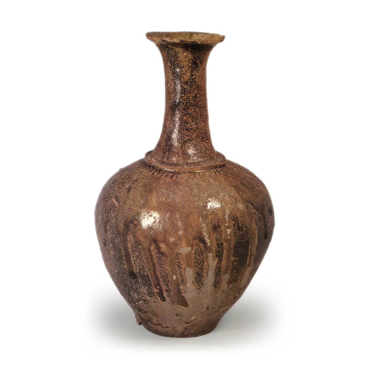 在颈部和肩部的接合处附加一条带子的技术在灰釉陶末期就已经开始了,12 世纪上半叶在罐子和瓶子上广泛使用。 肩部与托板接壤是早期东名陶器的另一个特点。 这种陶土含铁量高,耐火度稍低,用氧化铁烧制时,整体烧制效果会有轻微变形。 烧制的效果非常好,颈部的一部分和肩部的整个表面都上了一层绿褐色的釉,一直流到器身的下半部分,使这件水罐的外观非常迷人。 灰釉技术在早期的 Tokoname 中仍然存在,这件水罐上的灰釉是天然的还是人工的,还有待研究。 无论如何,这都是东名早期陶器中最精美的作品之一。