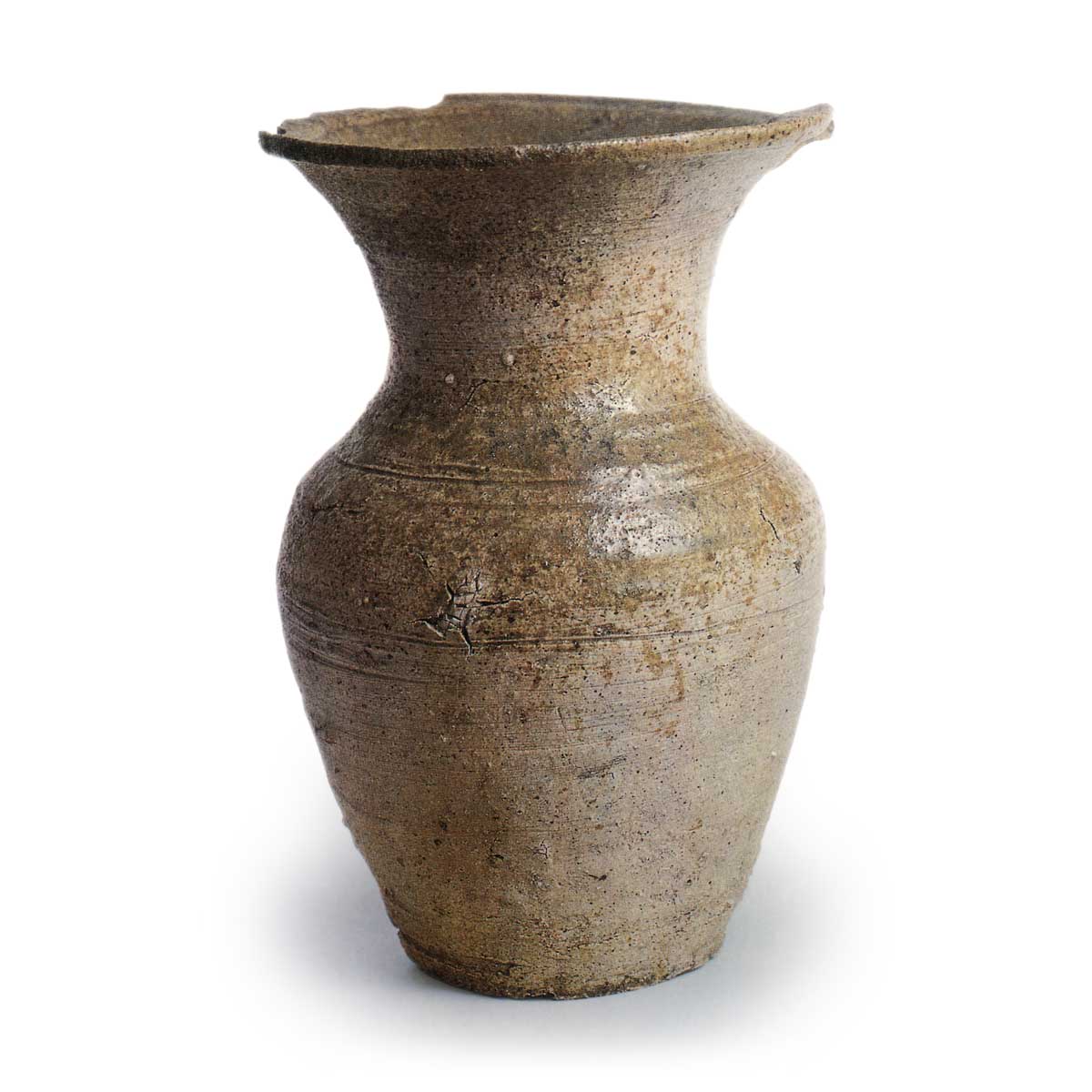 最后阶段的灰釉陶器在颈部和肩部之间有两层连接,两者之间有明显的边界,但传到 Tokoname 的样式则有一条从肩部延伸到颈部的平缓线条。 前一种陶器是用轮碾和水磨制成的,而赤塔半岛中部早期的 Tokoname 陶器和这件器皿一样,是用粘土抟制而成的,器壁厚实,器形扭曲。 它由含有卵石的高耐火度白色粘土制成,采用还原烧法烧制。 烧制的效果非常好,肩部有黄绿色的天然釉。 此外,还有一些长石颗粒,使其具有独特的东名白土特征。