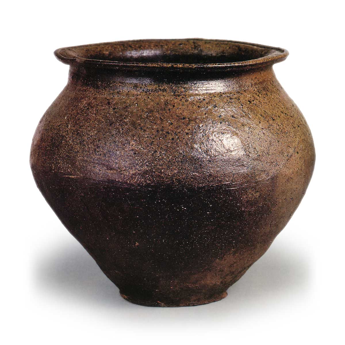 常滑罐 常滑渥美猿投常滑罐 2025.02.26 常滑罐 13 世纪。高 29.2 厘米、口径 26.2-27.0 厘米、身径 33.4 厘米、底径 12.5 厘米。爱知县陶瓷博物馆 这个相对较小的罐子有着与众不同的整洁外观。 圆盘形的罐身与略微向内倾斜的短颈之间的界限相当模糊,口沿向外折成直角,略微向上翻转,形成一条 8.5 毫米的边缘带,即所谓的 “沟”。 这种形式是镰仓时代早期的典型特征。 器身、肩部和颈部形成五层接合,碗面光滑平整。 烧制情况良好,器物呈黑褐色,肩部施淡淡的自然釉,呈腐叶色。 此罐可能是小型东名罐的最佳范例之一。