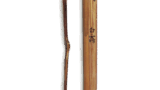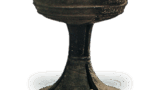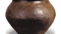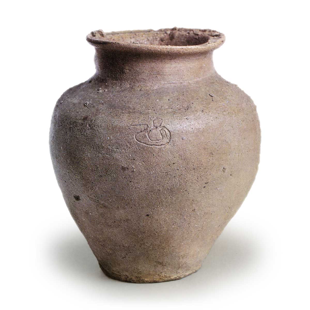 这件器物是 1951 年春天在野间的一个旧窑址出土的。 这种广口罐的造型与三足罐相似,肩部略粗,下半身细小,应为镰仓时代中期的作品。 它是用卷绳状粘土制成的,造型不是很好。 此罐的显著特点是肩部四边的雕刻,似乎是佛教造像或僧侣形象。 潇洒的圈足和简洁的线描将坐像刻画得惟妙惟肖。 这是一件极为罕见的作品,可能是为宗教用途而制作的。 能登岩仓寺有一件镰仓时代的大罐,上面刻有类似的人物雕刻,人们认为它与这件作品有共同之处。