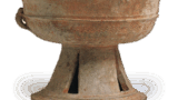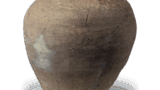 这种大碗被称为 “太平碗 ”或 “片口碗”,是 11 世纪末从灰釉陶器过渡到山茶碗时出现的一种新型地碗,具有中世纪窑炉的常见形式。 西日本和北陆地区的窑炉从镰仓时代中期(1185-1333 年)开始在内壁上雕刻篦子,但这种器皿的特点是直到室町时代晚期(1333-1573 年)才在濑户和常滑等东海地区的各种瓷器窑炉上雕刻篦子。 这件器物使用含有卵石的粗白粘土还原烧制而成,灰白色器物的内外表面均施以翠绿色的天然釉。 虽然它仍有一个隆起的底部,但口沿的圆边和臀部隆起的消失表明它的年代应为镰仓时代中期。