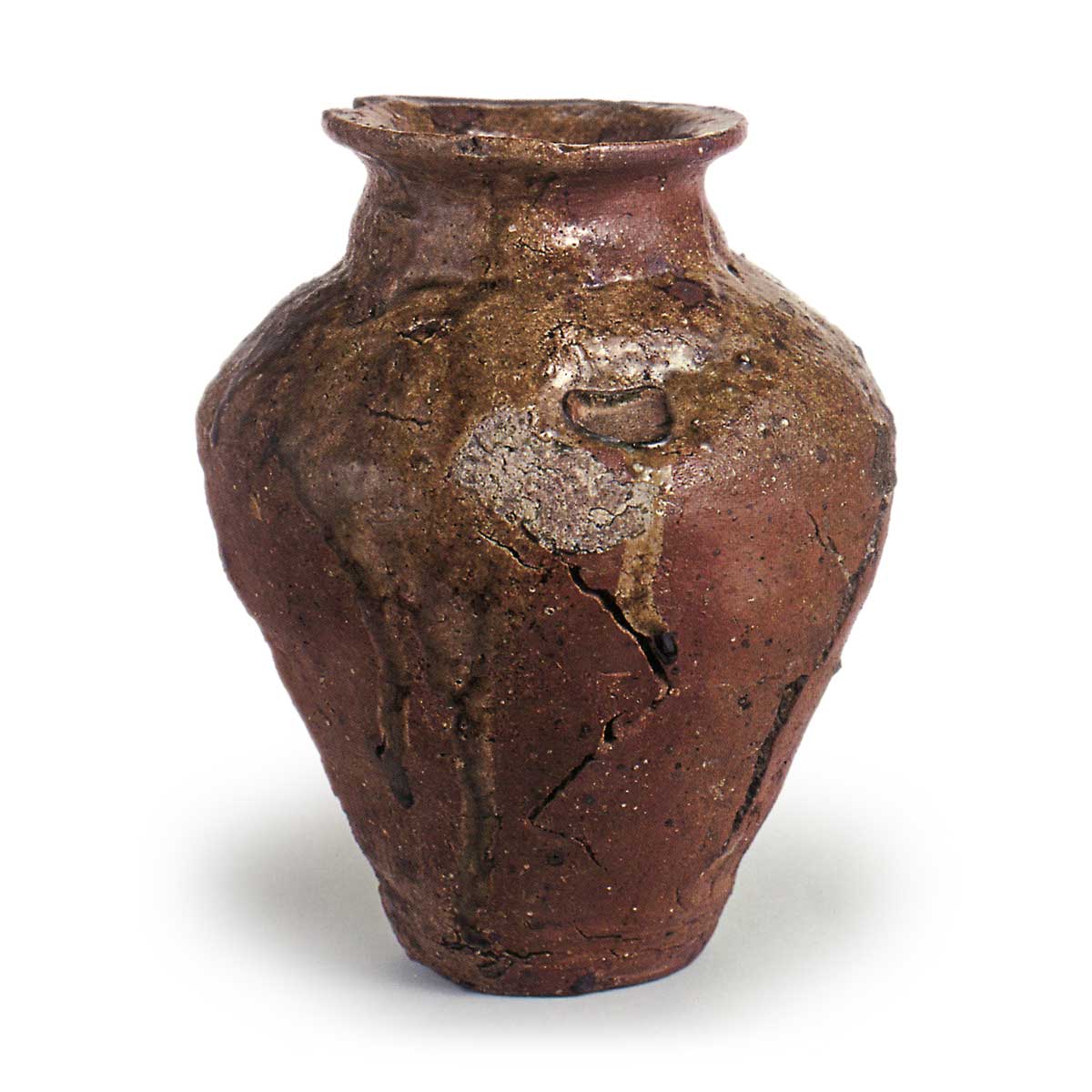 常滑罐 常滑渥美猿投常滑罐 2025.03.05 常滑罐 14 世纪。高 25.8 厘米、口径 12.5 厘米、身径 20.0 厘米、底径 9.0 厘米。常滑市陶瓷艺术研究所 此罐的造型与三嘴罐相同,另外还有一种没有刻纹的类型。 它很可能是平安时代晚期灰釉罐的变体。 此罐的颈部向内倾斜,罐身与底座呈直线,接近该系列罐的晚期。 褐棕色的底座带有长石漂白的东名特征色调,从肩部向下延伸至罐身的墨绿色天然釉与镰仓时代晚期的大罐和壶上的釉色相似。