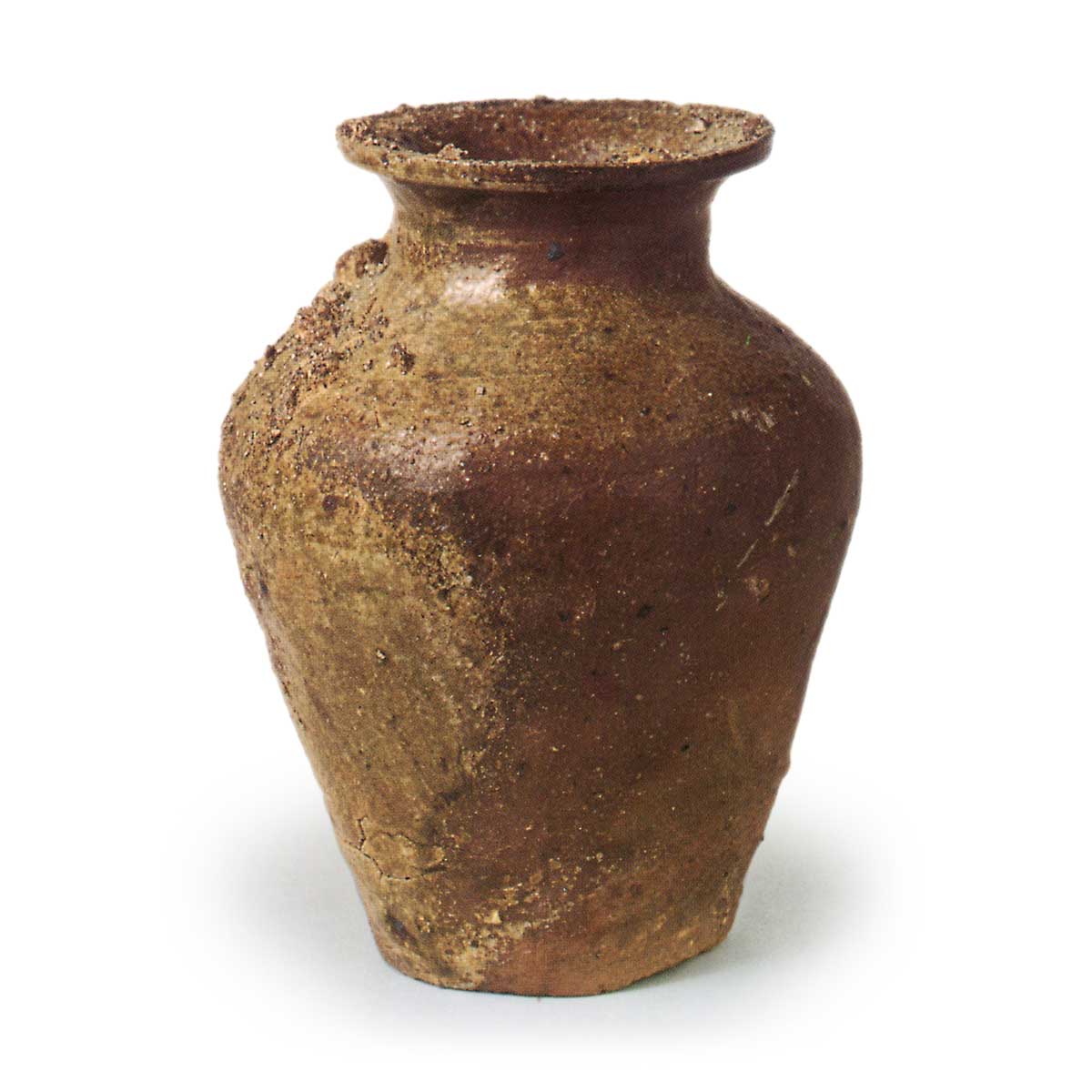 常滑罐 常滑渥美猿投常滑罐 2025.03.05 常滑罐 14 世纪。高 21.2 厘米、口径 11.0 厘米、身径 16.5 厘米、底径 9.0 厘米。常滑市陶瓷艺术研究所 罐身直向底部,肩部没有任何拉力,是该罐的晚期造型,但口颈仍然向外张开,这表明该罐的年代并非始于 14 世纪初。 它由富含铁元素的粘土制成,烧制得非常好,棕褐色的器皿表面施有天然的黄绿色釉。