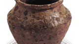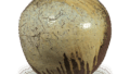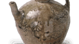 这个罐子是从与日莲圣人有关的清澄寺旁边的朝比之森的经冢上出土的经壳外层容器,其中一块碎鎏金铜经壳上刻有大永 3 年的铭文。 罐身圆鼓,颈部较小,口沿上缘有 7 毫米宽的倒角。 罐身由三层模制的绳状粘土制成,器表经过笔刷调整。 烧成情况良好,深绿色的天然釉顺着棕褐色的器表皮流淌。 这是研究室町时代早期罐子的重要参考资料。