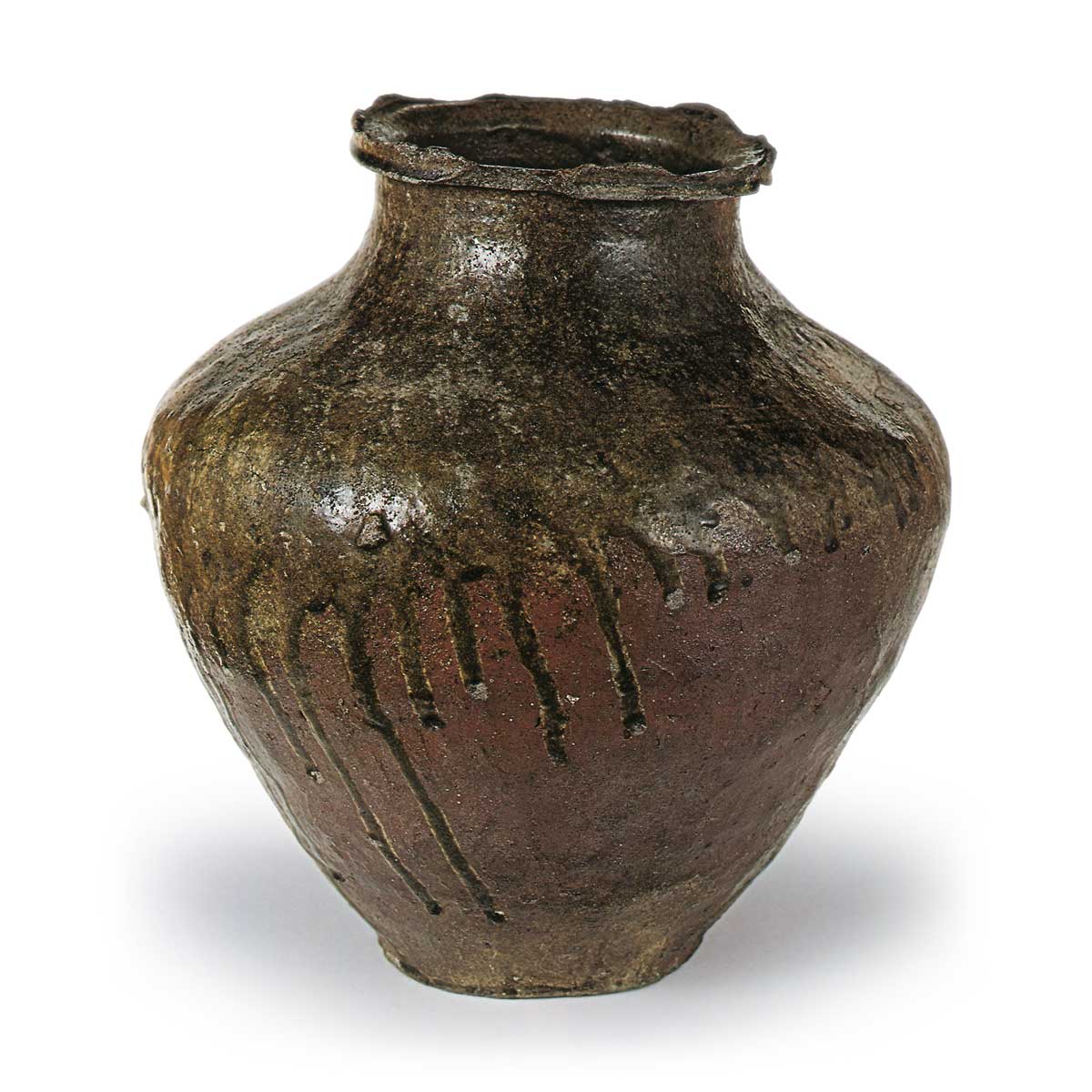 常滑罐 常滑渥美猿投常滑罐 2025.03.06 常滑罐 13 世纪。高 41.8 厘米,口直径 20.0 厘米,身直径 39.0 厘米,底直径 16.3 厘米。 这是镰仓时代中期典型的大罐之一。 到了镰仓时代,大罐的颈部变得更窄,从颈部到肩部的过渡部分呈平缓的弧形,使接缝变得不那么明显。 现在,口沿折回到字母 N 处,形成一条宽阔的绿色带,这是罐子常见的一种技术,目的是在罐子变大时保护口沿。