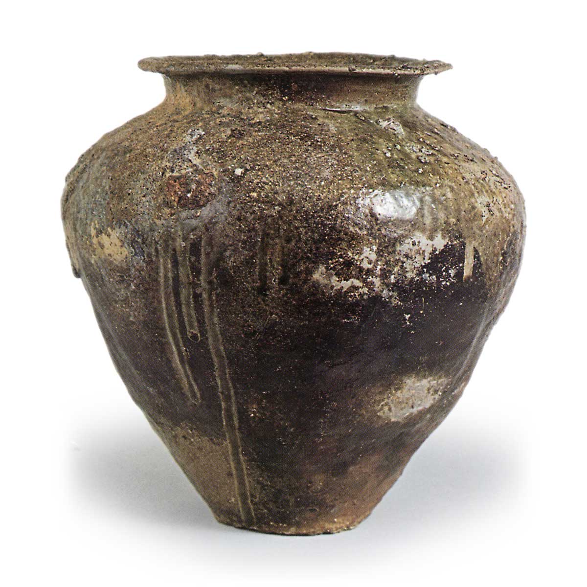 常滑罐 常滑渥美猿投常滑罐 2025.03.06 常滑罐 大阪丰野郡东乡村大字出野出土,12 世纪。高 33.6 厘米、口径 23.0 厘米、身径 34.8 厘米、底径 12.3 厘米。东京国立博物馆 口沿的边饰较薄,但肩部与口颈的接合处弧度平缓、模糊不清,肩部则结实有力、拐弯锐利。 陶土富含铁元素,器物烧制极为精良,表皮呈棕褐色,黄绿色的天然釉一直流淌到器身的下半部分。
