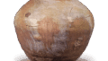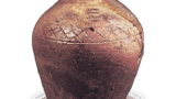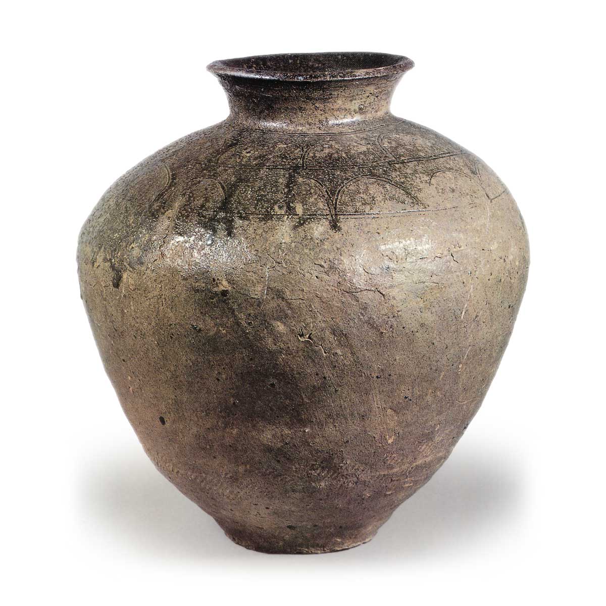 罐体由粗砂粘土制成,含铁量较高,器表有许多吹出的黑色小颗粒。 罐身由粘土缠绕而成,分三段连接,下段有模具捶打的痕迹,上段有磨平粘土的痕迹。 口颈向外翻出,口沿加厚并斜切,没有折回,使其横截面呈三角形。 图案由肩部三条平行的半截竹筒组成,中间穿插着双线向上的半圆弧。 这种设计适合称为 “弧线系列”,而不是 “莲瓣设计”。 这种横线内交错的弧形图案是渥美窑中型罐经常采用的设计,因此,无论从泥料、模制还是设计上看,这件器物都是渥美窑的产品,这一点毋庸置疑。 强火导致烧制过程中出现裂缝,肩部的半表面严重变形。