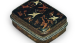 这件藏品是 1918 年 9 月在神木山西南高原的一个经冢中出土的,当时还出土了一个铜经盒、日本镜、短剑和影青枸杞,这清楚地表明它曾被用作经盒的外容器。 盖子是用一个直径 22 厘米的扁平大碗制成的。