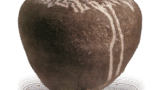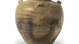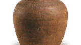 渥美刻有条纹的花瓶 常滑渥美猿投渥美刻有条纹的花瓶 2025.03.06 渥美刻有条纹的花瓶 12 世纪。高 45.8 厘米、口径 15.0 厘米、身径 39.7 厘米、底径 12.8 厘米。爱知县陶瓷博物馆 大罐有肩带,颈部上半部被打磨掉。 口沿有一个大喇叭形开口。 底部有丰富的沙质粘土,由卷绳成型。 肩部上缘和中央画有平行的下沉线,中央下沉线与上下弧线之间有八条向上的弧线。 此外,在中央凹陷线与扶壁之间还有三条蜿蜒的凹陷线。 这是渥美独特的莲瓣纹罐的代表作之一,器表因熏蒸还原烧制而发黑。 因此被称为 “黑罐”。