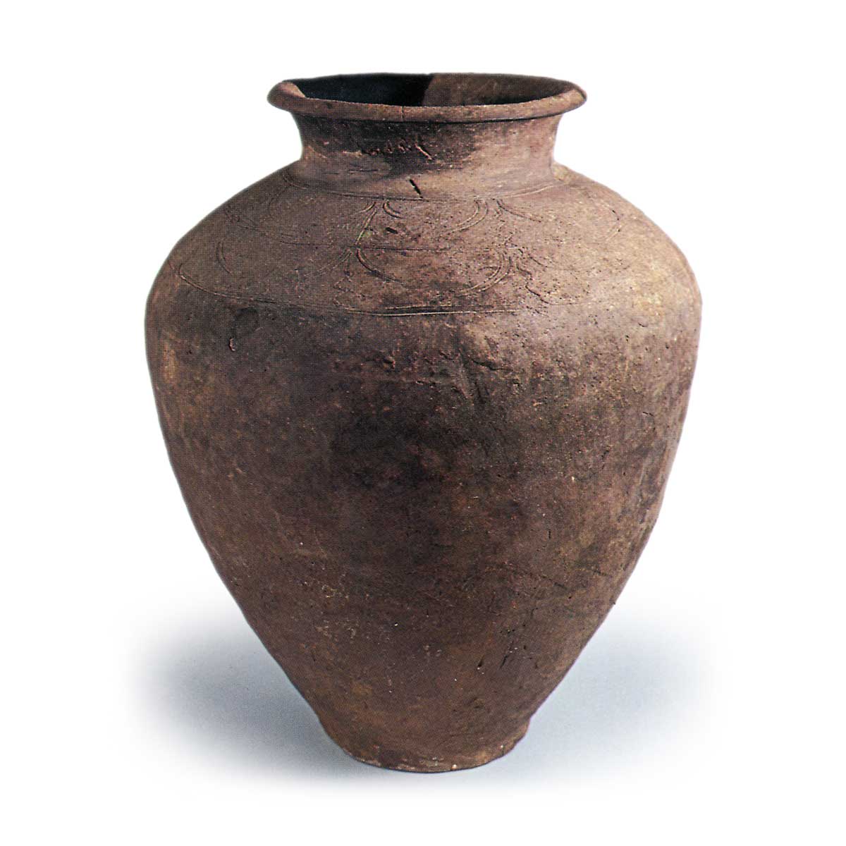 肩部的图案由三条平行的下沉线组成,并用同样的工具画出弧线,呈 “八 ”字形,中间是蜿蜒的平行下沉线图案,显示了刻有图案的渥美窑罐的一种样式。 与前者一样,烧成情况并不好。
