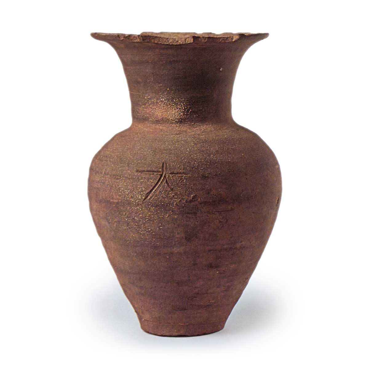 渥美大号广口瓶 常滑渥美猿投渥美大号广口瓶 2025.03.09 渥美大号广口瓶 12 世纪。高 25.7 厘米,口径 15.3 厘米,身径 16.9 厘米,底径 7.1 厘米。 这是东海地区山茶碗窑早期的一种碗形,源于平安时代晚期的灰釉广口瓶。 碗颈的喇叭形大口与碗身分开制作,然后连接在一起,显示出碗的早期形式。 它是在模制过程中卷起的线状粘土,制作工整。 烧成情况相对较好,表面因熏烧而变黑。 肩部刻有 “大 ”字。 这种铭文在东名和其他地区经常使用。 它可能具有宗教意义。
