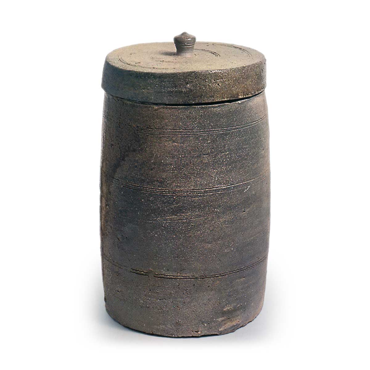 渥美经筒外筒 常滑渥美猿投渥美经筒外筒 2025.03.09 渥美经筒外筒 12 世纪。总高 37.0 厘米,盖子直径 20.5 厘米。本田收藏。 渥美窑的特色之一是经筒的外容器。 其主要供应来源是伊势熊野地区。 有相当数量的物品已知出处,包括伊势市的浅草山经筒冢。 这件器皿的出处不详,但很可能是上述器皿之一。 它的类型略有更新,器身的隆起已经消失,完全变成了圆柱形,盖子的侧边与上表面成直角,但器身上保留了三条平行的凹陷线,因此它可能属于 12 世纪时期。