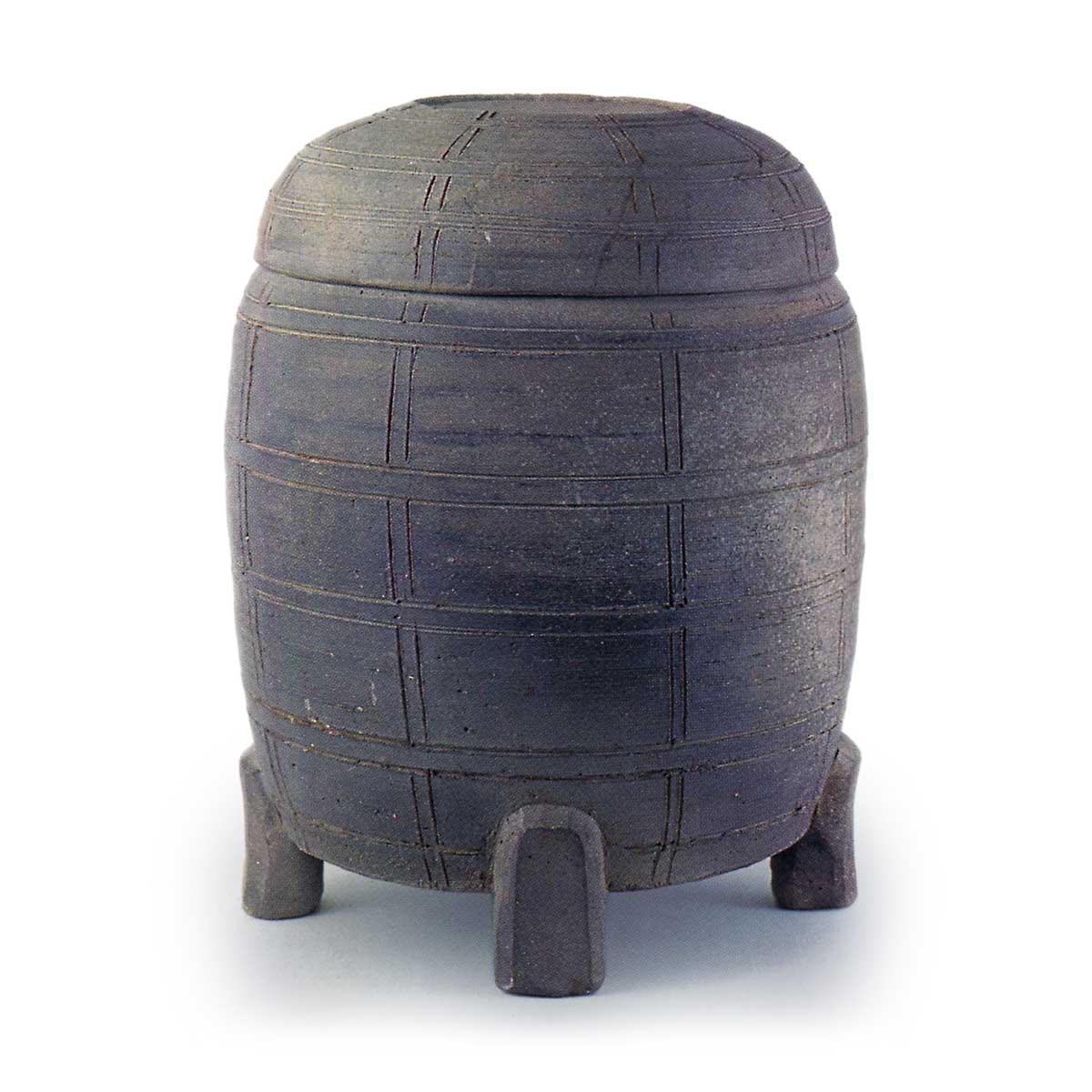 渥美袈裟襷文四足壺 常滑渥美猿投渥美袈裟襷文四足壺 2025.03.09 渥美袈裟襷文四足壺 十二世纪。总高 35.0 厘米,盖子直径 26.0 厘米,壶身直径 20.5 厘米,壶身直径 28.4 厘米爱知县陶瓷博物馆 虽然出处不详,但从造型上看,这显然是一件经筒外器,据说还伴有影蓝色的葫芦。 器身饰有 “格萨 ”形铭文,铭文上有五条平行的下沉线和八条交叉的竖线。 盖子顶部脱落,但在弯曲部分装饰有与器身相同的 “kesa-dasuki ”图案。 陶土呈灰黑色,质地致密,造型极为细致。 烧成情况良好,器身侧缘部分施有黄白色的天然釉。