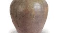 从造型和设计来看,这可能是一件经筒外器,但出处不详。 已知还有一件与此完全相同的器物。 盖子顶部有一个低矮的圆柱形带子,内部缺失,因此无法作为盖子使用。 上面可能盖过什么东西。 盖子的肩部有两条凹陷的线,线与线之间有双锯齿状花纹。