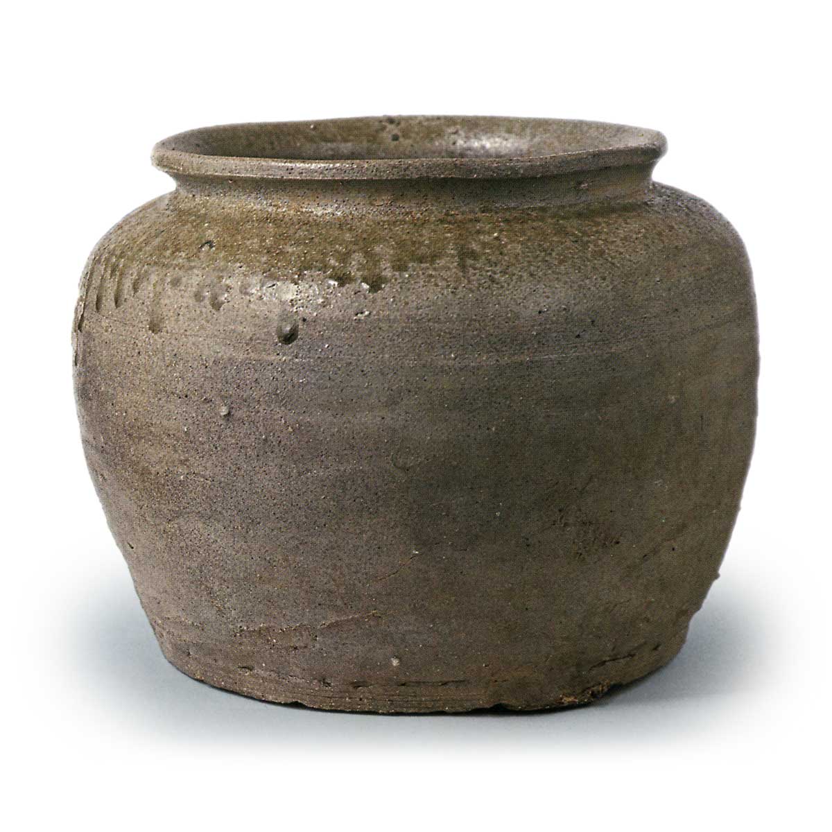 猿投广口罐 常滑渥美猿投猿投广口罐 2025.03.10 猿投广口罐 12 世纪。高 21.2 厘米,口径 21.8 厘米,身径 29.4 厘米,底径 22.2 厘米。 这是一件鲜为人知的短而宽肩的器皿,可视为罐或壶。 它的特点是底大。 它由致密的灰白色粘土制成,用绳状粘土缠绕轮抛,器身的下半部分经过切割调整。 肩部施深绿色天然釉。 从材质和烧制来看,它很可能属于 12 世纪早期的萨鲁托伽玛器。