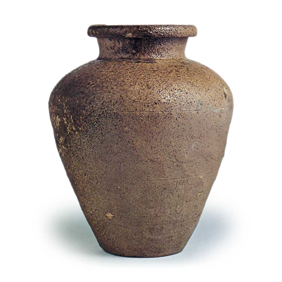 猿投三线锅 常滑渥美猿投猿投三线锅 2025.03.10 猿投三线锅 13 世纪。高 22.6 厘米、口径 10.8 厘米、身径 18.2 厘米、底径 7.8 厘米。爱知县陶瓷博物馆 相对较短的宽口颈部、略微倾斜的肩部以及向底部逐渐变细的线形,表明这是一件 13 世纪早期的作品。 器身上的三条凹陷线是其独特之处。 近白色的底部含有许多细小的铁屑,烧制工艺表明它属于山下窑类别。 这三道纹与东名三道纹瓶上的纹饰相似,但并不是受东名的影响而产生的,应该是图 117 所示经盒外器上三道平行纹的缩写。