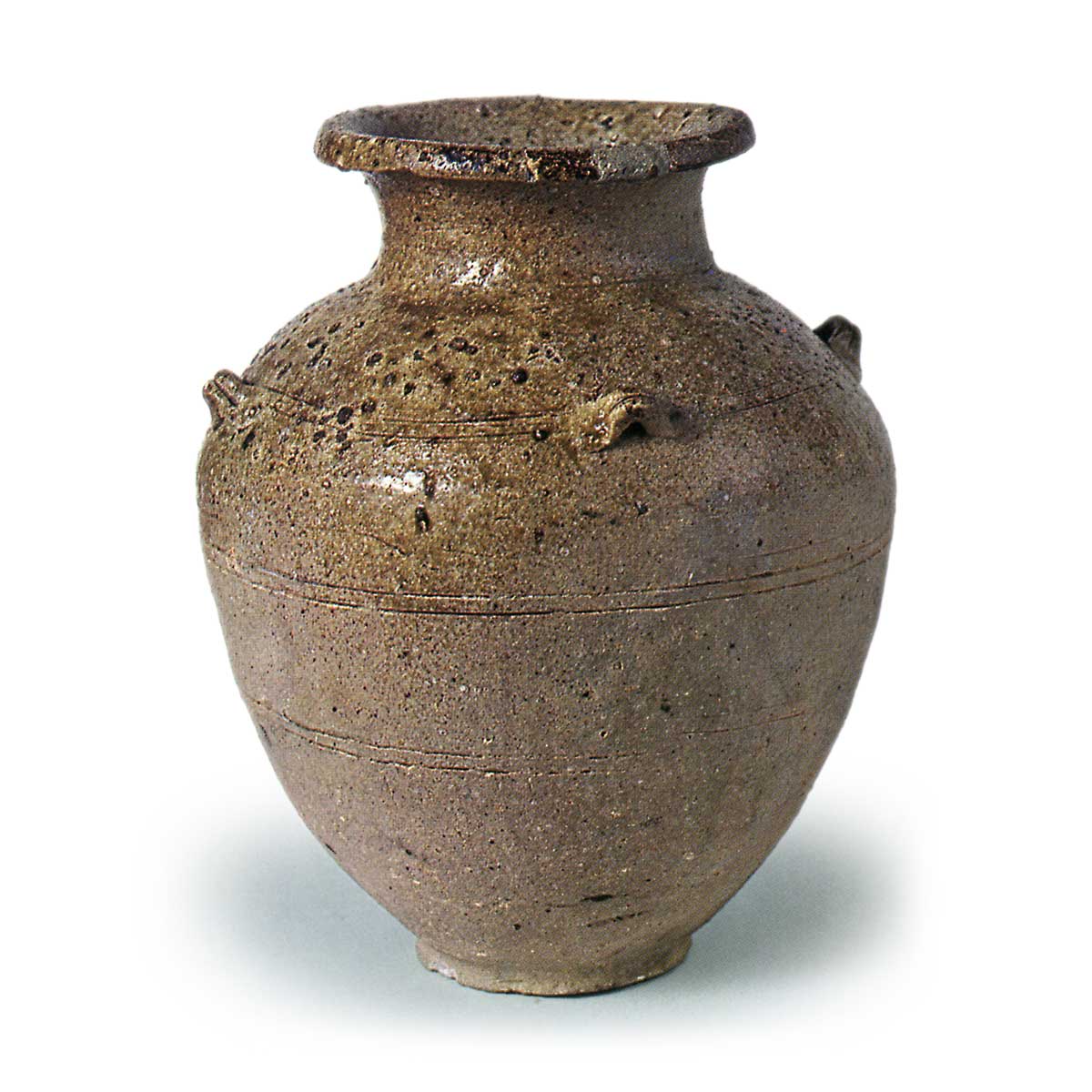 这件四叶罐的罐身隆起,由含有许多细铁颗粒的灰白色粗粘土制成。 口颈中部收缩,口沿敞口,口沿边缘有一个三角形横截面。 罐身有三条平行的平行条纹。 此罐可称为四耳三条纹罐,其来源尚不清楚。 不过,从底部和肩部的釉色来看,它与赤塔半岛附近山形窑南部出土的早期山茶碗非常相似,因此被归入山形窑一类。 就年代而言,它被认为可追溯到 12 世纪上半叶。 顺便提一下,罐体上的三列平行下沉线纹的排列方式与常滑三味线纹罐相似,可以认为常滑三味线纹罐是常滑三味线纹罐的原型。 在经盒(图 117)的外层器皿上也可以看到这样的三行平行下沉线图案,其设计手法与经盒相同。 这种设计在中国邳州窑系的翎毛瓶上经常出现,据说是受这些器皿的影响,山下窑很早就采用了这种设计。