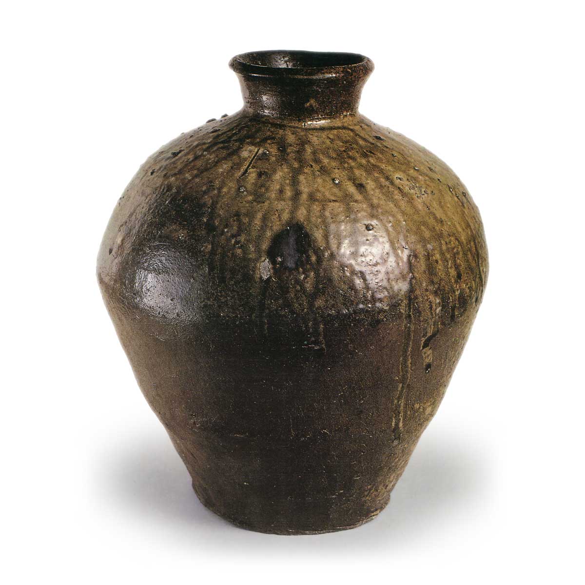 越前罐 日本越前罐 2025.03.11 越前罐 15 世纪。高 41.0 厘米、口径 13.2 厘米、身径 35.2 厘米、底径 17.8 厘米。福井县立陶瓷博物馆 此瓶口颈略微向外直立、细长,肩部圆润,瓶身下半部向底部伸直,肩部边缘有一道脊线,形状有点像算术碗。 圆肩和小而窄的颈部可视为越前陶器的特征。 器身的下半部分通过垂直接缝进行调整。 深绿色的天然釉大面积地施在深褐色器皮的整个肩部,其中一部分一直延伸到器身的下半部分,进一步增强了该罐的美学效果。 简洁的造型、器表的色调和釉面的效果使其成为中世纪越前陶器中最优秀的作品之一。