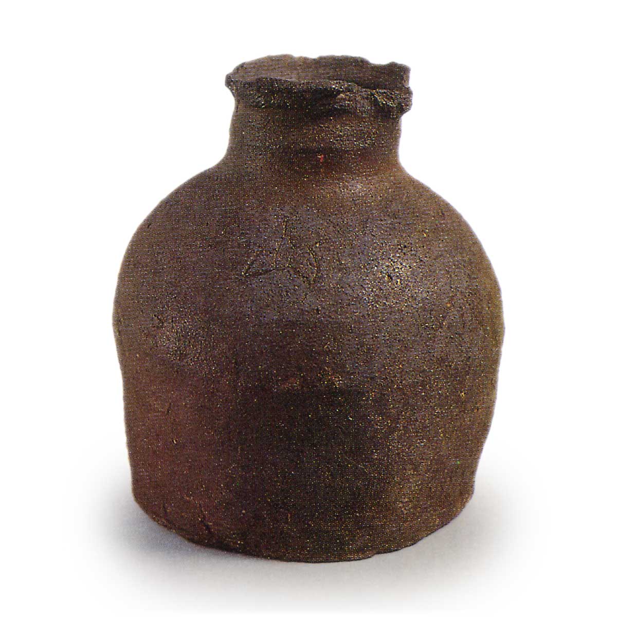 越前黑锅 日本越前黑锅 2025.03.11 越前黑锅 15 世纪。高 15.6 厘米,口径 6.6 厘米,身径 13.9 厘米,底径 11.7 厘米。 这也是最古老的所谓牙瓶之一。 3.5 厘米长的口颈先端向后折叠,形成 N 形口沿。 它的泥质相当粗糙,呈深褐色。 大底座、接近器身的直径和口沿的形状可推定为 15 世纪中叶的作品。 肩部有彩绘铭文。