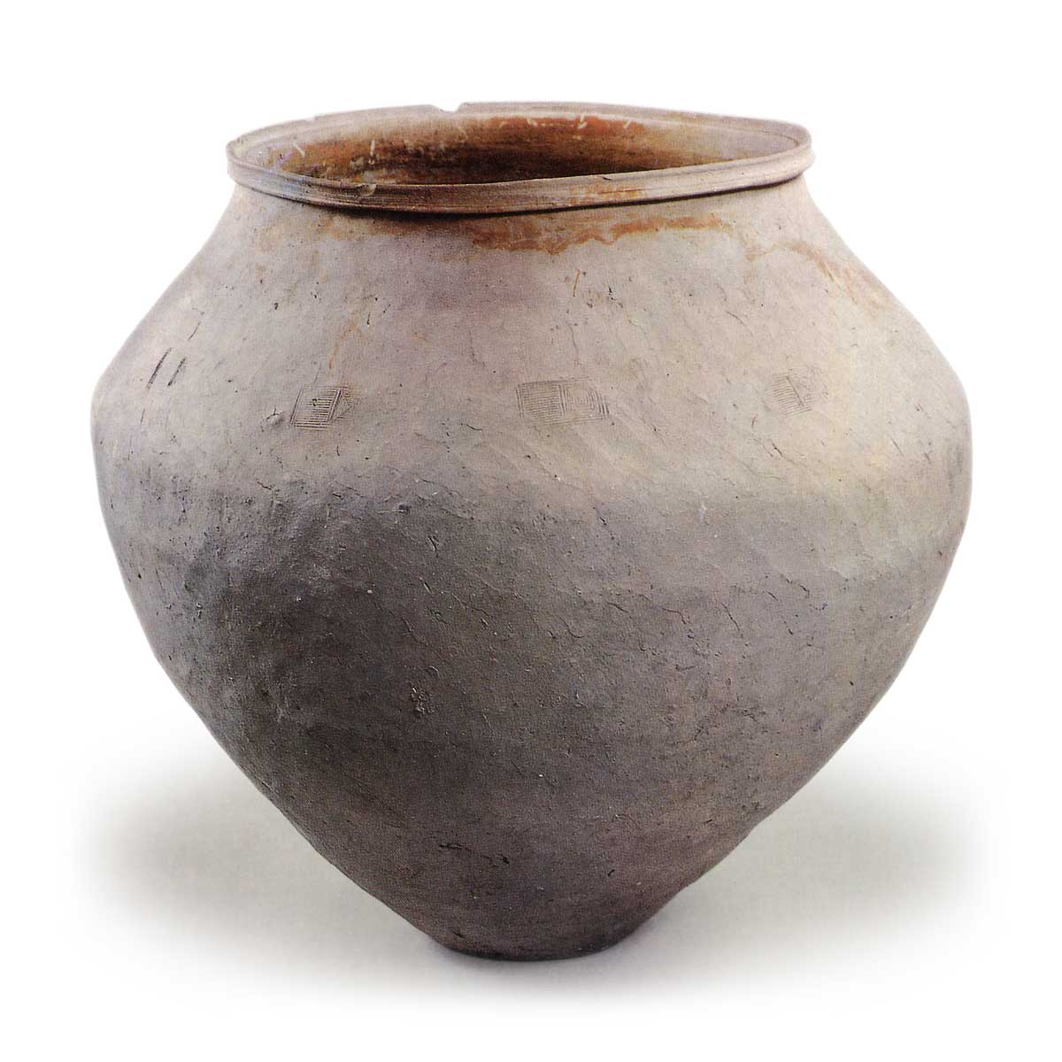 这是目前所知的唯一一件完整的加贺窑大罐。 口缘边缘呈 “N ”字形向后折叠,形成宽阔的口缘带,就器形而言,它与越前陶器相比更类似于东名陶器。 这可能是因为越前陶器的耐火度较低。 这被认为是由于需要加强口沿处的强度。 陶器表面呈细粒灰白色,烧制温度不高。 整件器物以七层环模成型,器面用刷子垂直调整。 器肩周围每隔约 20 厘米有一个长方形封印。 从口沿的结构和肩部的张力来看,其制作年代应为镰仓时代晚期。