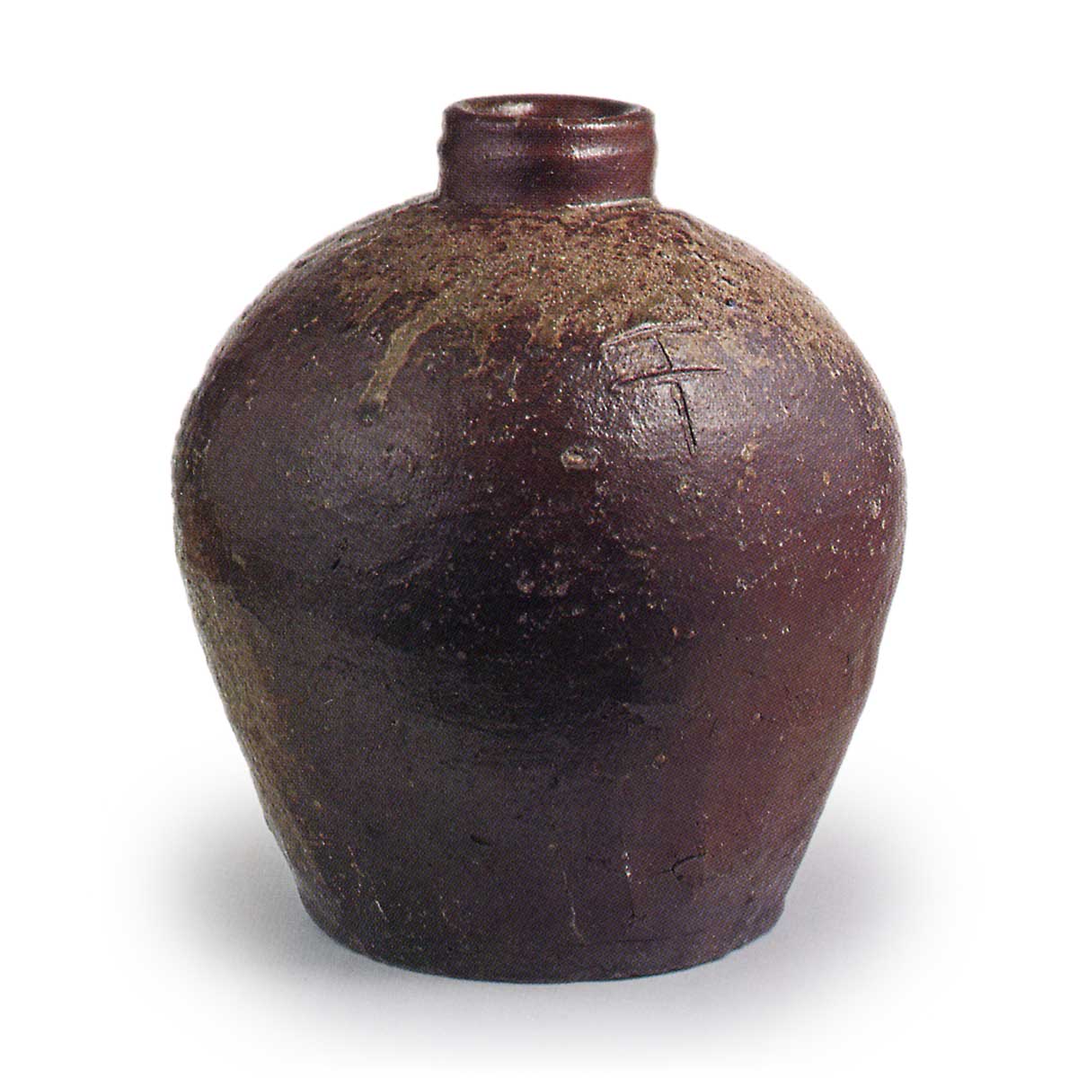 越前瓶 日本越前瓶 2025.04.01 越前瓶 16 世纪。高 24.4 厘米,口径 6.4 厘米,身径 22.3 厘米,底径 14.2 厘米。 这件器物与众不同,器身呈稳定的球形,口颈较小,应视为花瓶而非罐子。 口沿下有一个凸起的台阶,让人联想到梅瓶的颈部。 目前没有其他同类器物,因此很难追溯其源流,但从其宽底器身来看,其年代应为 16 世纪。 肩部有明显的越前窑 10 号款。