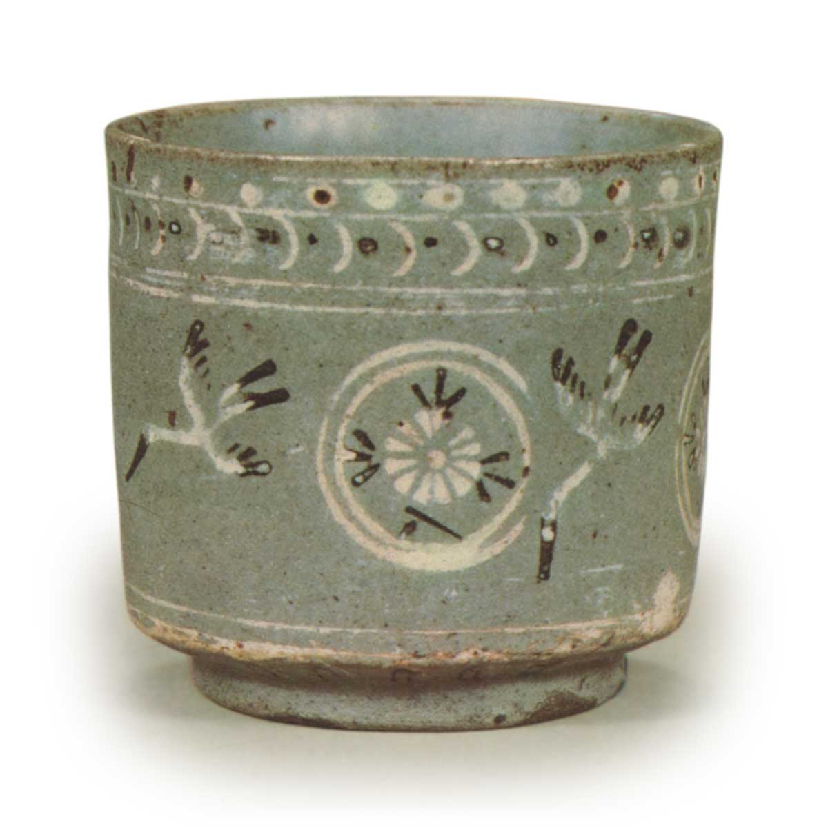 京都茶人、大文字屋、疋田宗观所藏,故称疋田筒。亦称大文字屋筒。此茶碗产自朝鲜,可追溯至高丽末期,堪称朝鲜产茶碗中最古老的器物。高丽时代朝鲜最常见的茶碗是高丽青瓷。 当然,最初是受到中国青瓷的影响而诞生,但后来发展出在胎体上嵌入白、黑两色陶土以表现纹样的“象嵌青瓷”技法。这只茶碗便是其中之一。