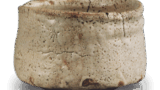 御所丸所用的金海陶土,与坚硬陶土较为接近,是一种半磁质的白色细土,烧制后质地坚实。将此陶土以快速糖櫨技法塑形为笔洗造型,两侧稍加压制成椭圆形,随后在腰部数处刻入大型箆目,最终成型。这正是织部沓形的原貌。 碗口部分从茶笙处向下深挖出一段,形成极为深邃的碗壁。高台并非普通的轮高台,而是截成五角或六角的极具武刚之气的形状。这正是织部风格中充满活力与张力的杰作。 其上施以富含长石的白色釉料烧制。前作中釉料氧化呈现志野风格的红色调,而此茶碗则还原烧制,呈现青色调。
