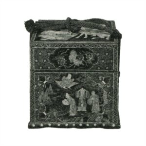 附件:铭牌一张,书写者织田有乐斎,铭牌袋,内盒桐春庆漆,外盒青贝唐人物纹样,附状一通,转让状一通