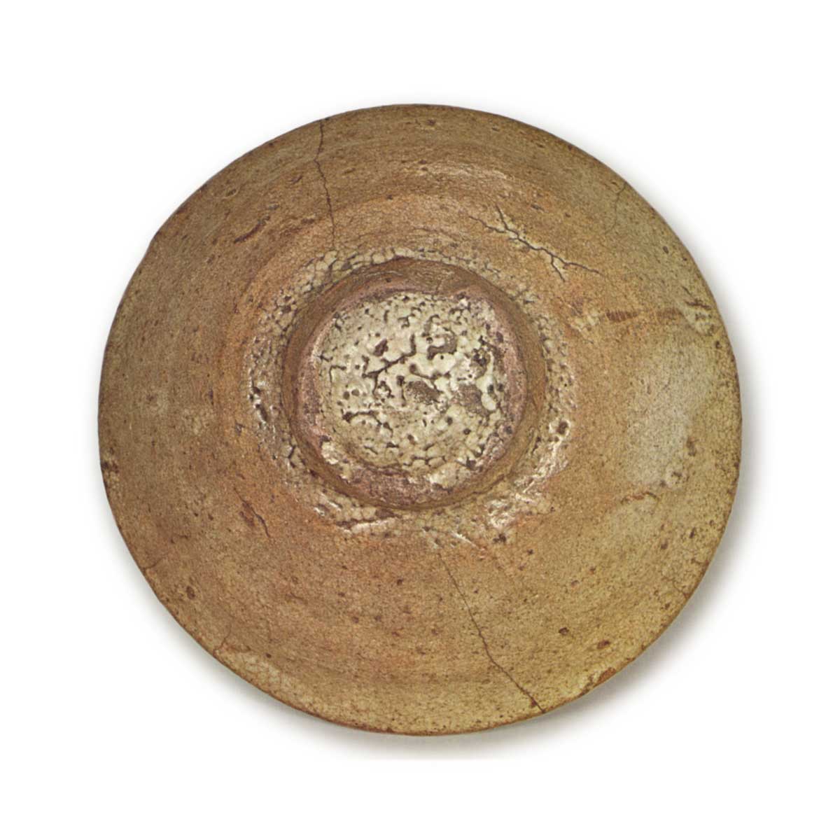 高台旁和高台内,如往常般出现开裂纹,但由于削切较浅,并未形成特别突出的纹理。底部中央沉陷形成涡旋状的茶色凹槽,四周环绕着四个红黑色的纹路。内壁釉面部分呈现蛇蝎状的扭曲纹理,其中夹杂着红黑色的斑点,更增添了几分趣味。