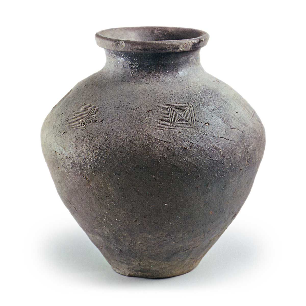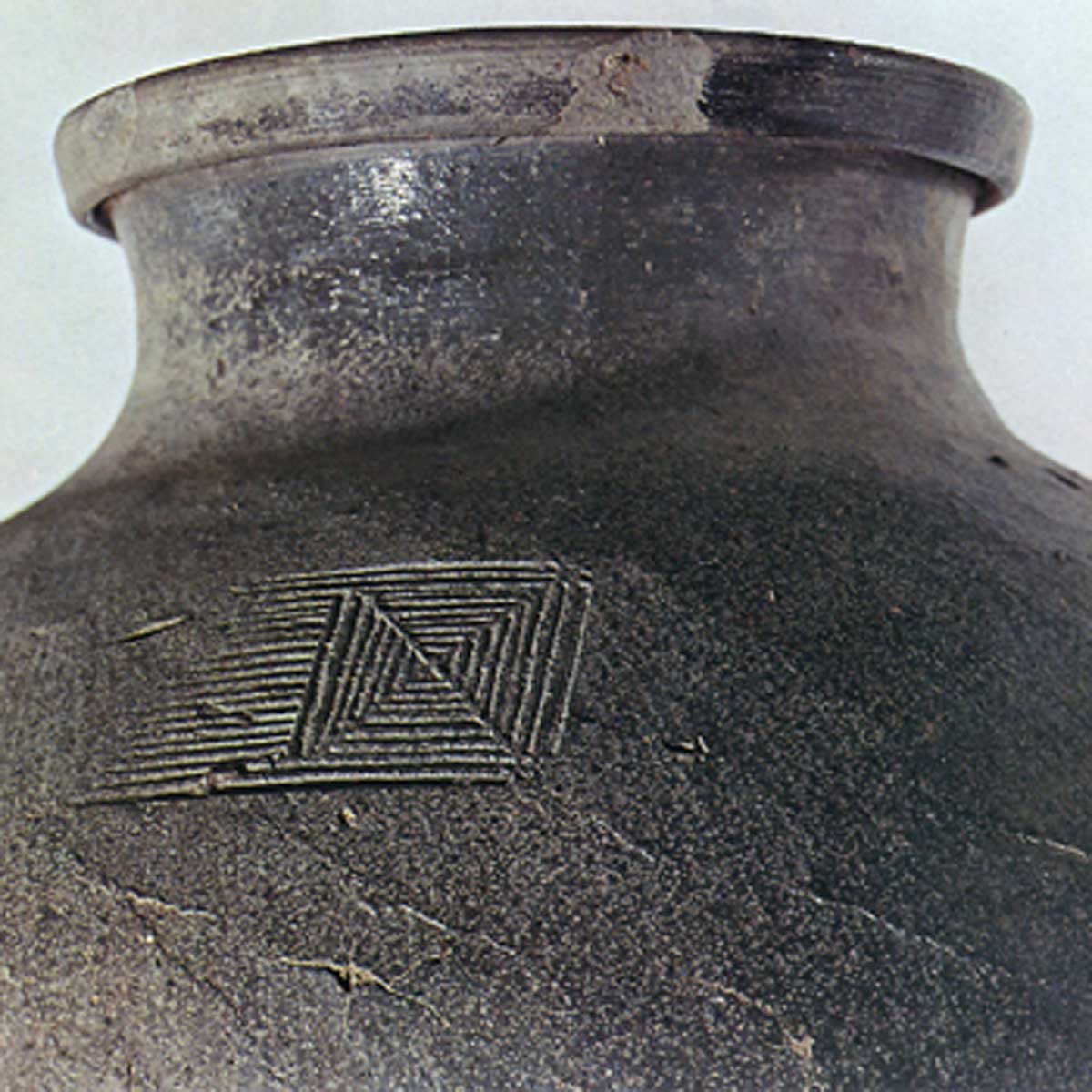 加贺锅 日本加贺锅 2025.05.12 加贺锅 加贺锅 石川县小松市牧口町出土14世纪高度33.0厘米 口径15.4厘米 胴径30.0厘米 底径12.0厘米小松市立博物馆这是加贺古陶中为数不多的完整器物之一。器身呈灰白色,表面散布着光泽的黑色斑点。肩部压印的印痕与用于器面调整的刷痕状态完全一致,与牧口町出土的大甕(图17)完全相同,明确证实为同一窑址的产品。