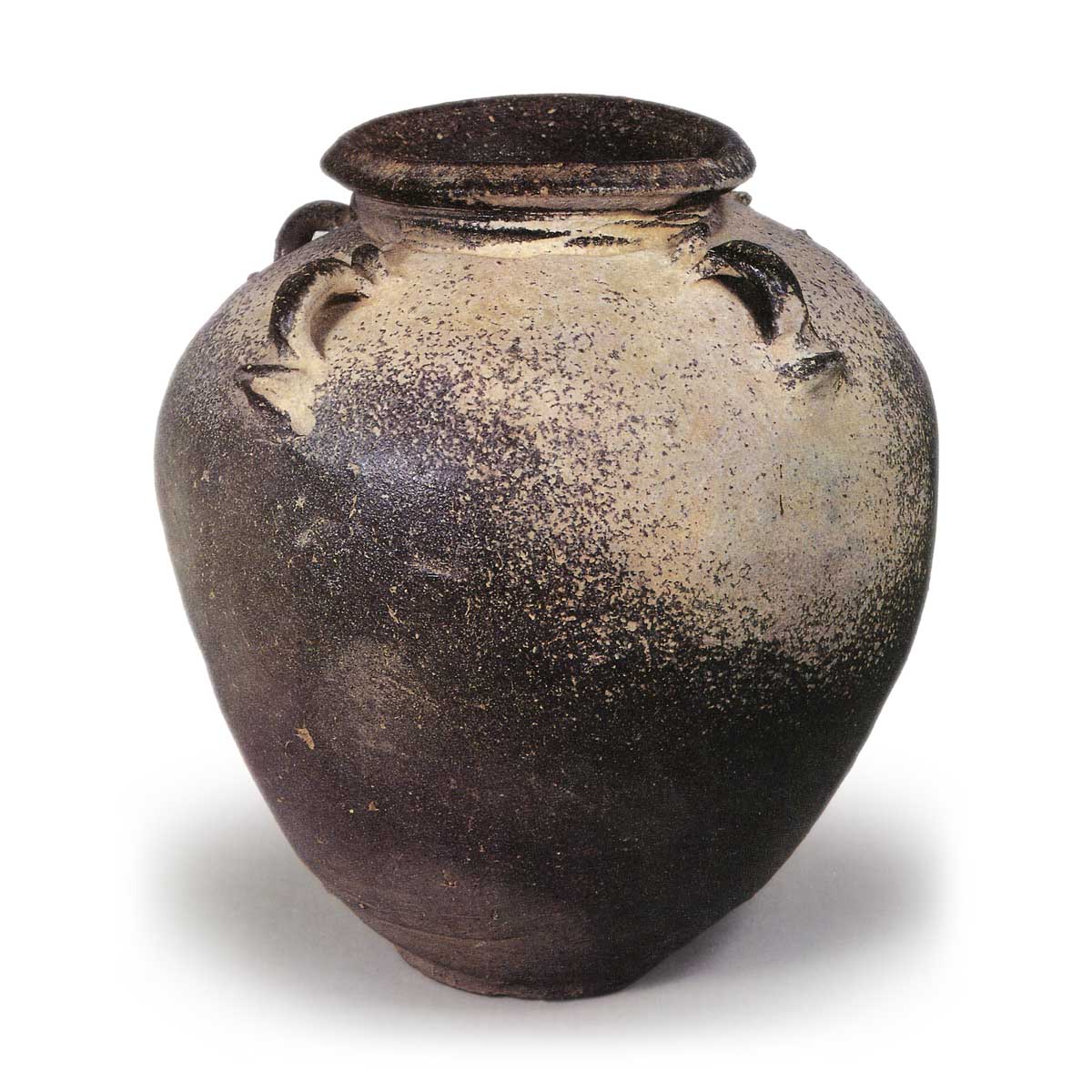 肩部两端各有一对竖立的四耳,其耳形是珠洲烧独有的特色,在中世纪陶器中绝无仅有。 这件四耳壶是否继承了北陆平安时代须惠器双耳壶那种夸张耳部的传统,值得探讨。底部采用静止线切割,胴部以绳索连接,经板状敲打成型后,再以箟削工艺调整器面。这是镰仓后期代表性的作品。