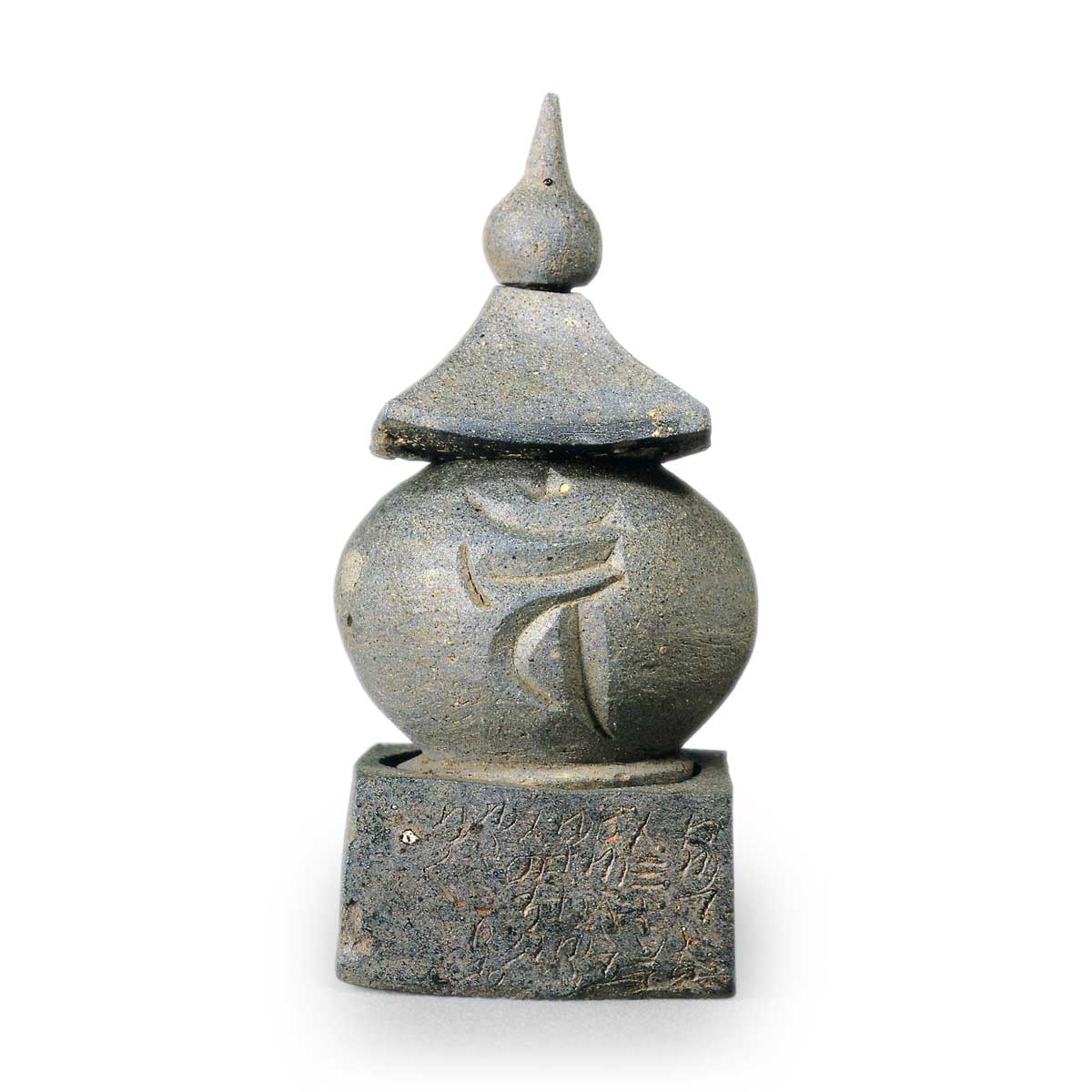 珠洲五輪塔 日本 2025.05.12 珠洲五輪塔 传出能登13世纪 总高22.8厘米 火轮边长8.6厘米 水轮直径10.7厘米 地轮边长10.1×9.0厘米爱知县陶瓷资料馆中世纪的陶制五轮小塔目前仅知存世6例,而这座五轮塔是其中制作最为精良的,其地轮侧面三面刻有疑似镇魂歌的和歌,是极为罕见的珍品。该塔由空风轮、火轮、水轮、地轮四部分构成,火轮上下及地轮处设有插槽,通过插入柄部进行组装。 水轮中央以药研雕刻法刻有金刚界大日如来的种子字“バン”,背面刻有“加德”二字。这是体现为逝者追善供养风俗的良好例证。