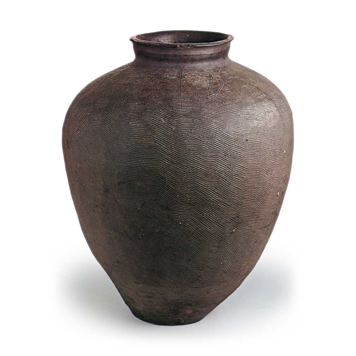 珠洲刻文壺 日本珠洲刻文壺 2025.05.14 珠洲刻文壺 14世纪高度50.4厘米,口径19.2厘米,胴径42.6厘米,底径14.2厘米这是珠洲烧最能体现其特色的作品。直立的口颈部上端加厚,可见9毫米的倒角。此外,口颈部中央向外凸出也是这一时期的特点。 采用绳索成型技法,将器身全面敲打成綾杉纹,开始显现出略带多面体的趋势。底部侧缘以箟敲打削去纹饰进行整形。肩部平行沉线刻有大型“九”字纹。为14世纪中叶的作品。