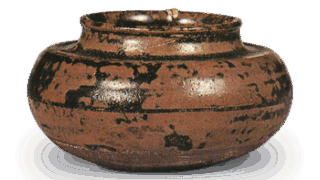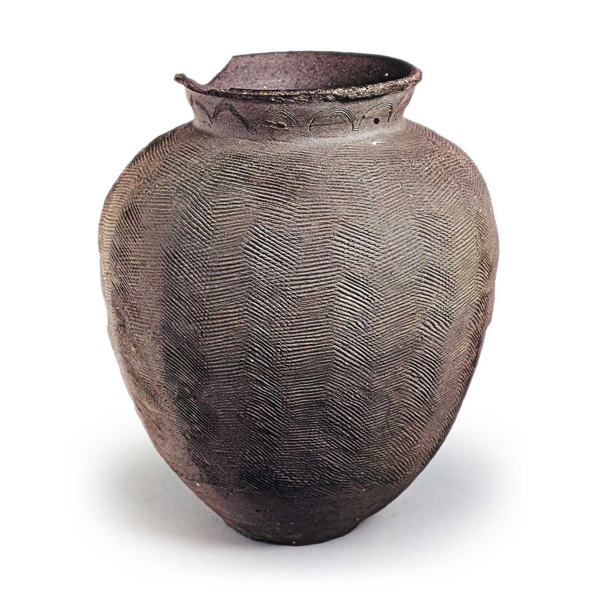这是珠洲烧全盛时期的代表作之一。颈部略微外展直立,其上端向外弯曲,形成带有梳齿波纹的边缘带。 器身略呈斜肩形,以綾杉纹敲打收紧的条纹敲打纹饰 sharp,呈现室町初期多面体形的特色。口径部以五齿櫛描绘出大型波纹纹饰。这是櫛目技法盛行的时期作品。底部侧缘以敲打纹为模板削削整形。