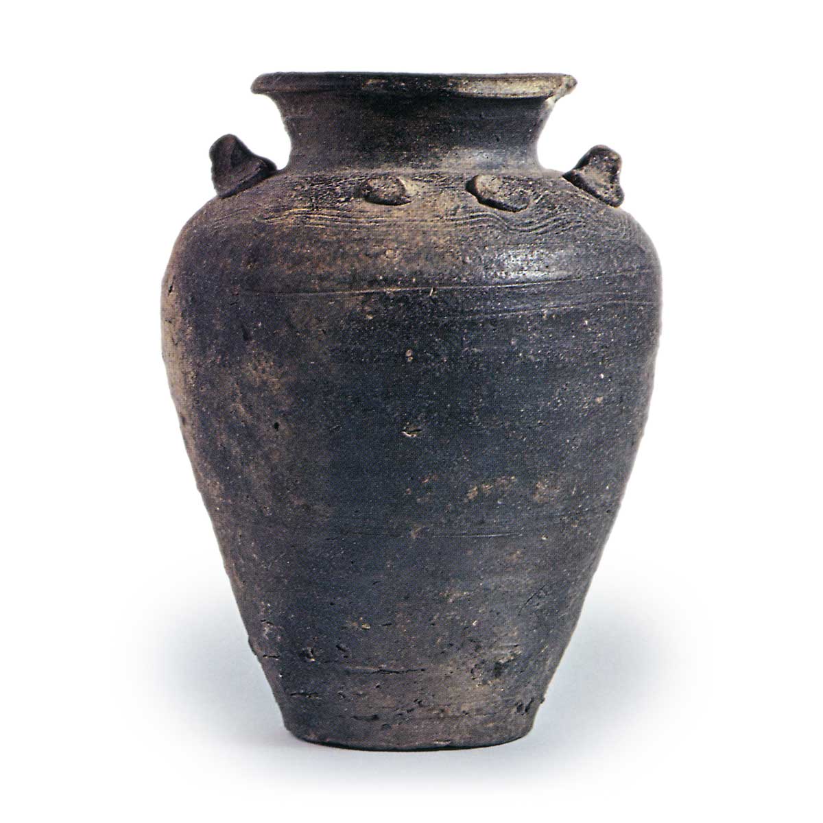 珠洲櫛目文四耳壺 日本珠洲櫛目文四耳壺 X Facebook Hatena Bookmark LINE Pinterest 复制 2025.05.14 珠洲櫛目文四耳壺 石川县能美郡辰之口町长滝经塚出土13世纪高度22.3厘米,口径11.4厘米,胴径17.1厘米,底径8.5厘米带有古瀬戸风格的横耳的四耳壶在珠洲烧中较为罕见,可能需要考虑其影响。 口颈部外翻的尖端向外折曲,形成圆润的边缘带。采用绳土制作卷起成型,壶身下半部削削,上半部横向抚平整形,肩部饰有两道梳齿波纹。烧成略显柔和,器面呈现光泽的黑色。