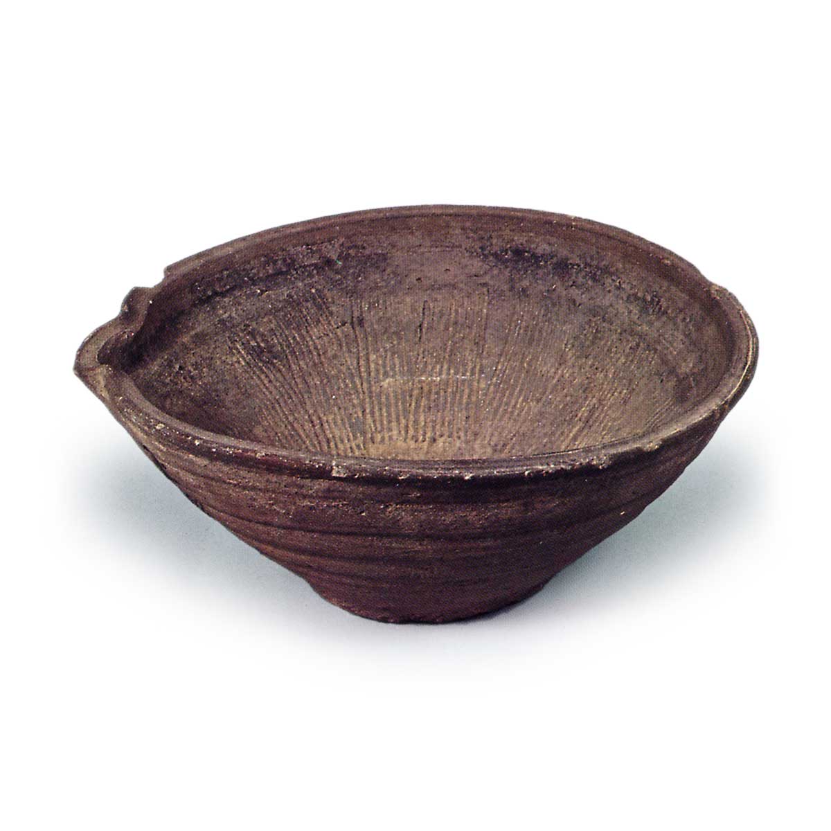 珠洲擂鉢 容器珠洲擂鉢 X Facebook Hatena Bookmark LINE Pinterest 复制 2025.05.14 珠洲擂鉢 出土于石川县珠洲市庄院町庄院。15 世纪。高 12.3 厘米,口径 31.6 厘米,底径 12.0 厘米。这是一件用绳纹粘土制成的轮掷器,器物的侧缘有轮掷褶皱的痕迹,做工比前两件器物差。 口沿边缘略向外突出,上表面有一条向内倾斜的宽沿带。 底部仍有线切割痕迹。 口沿有一部分折叠成一个口器,但突出的程度很小。 这可能表明它很新。 内表面密布八齿宽梳。 这件作品是室町时代早期的代表作。