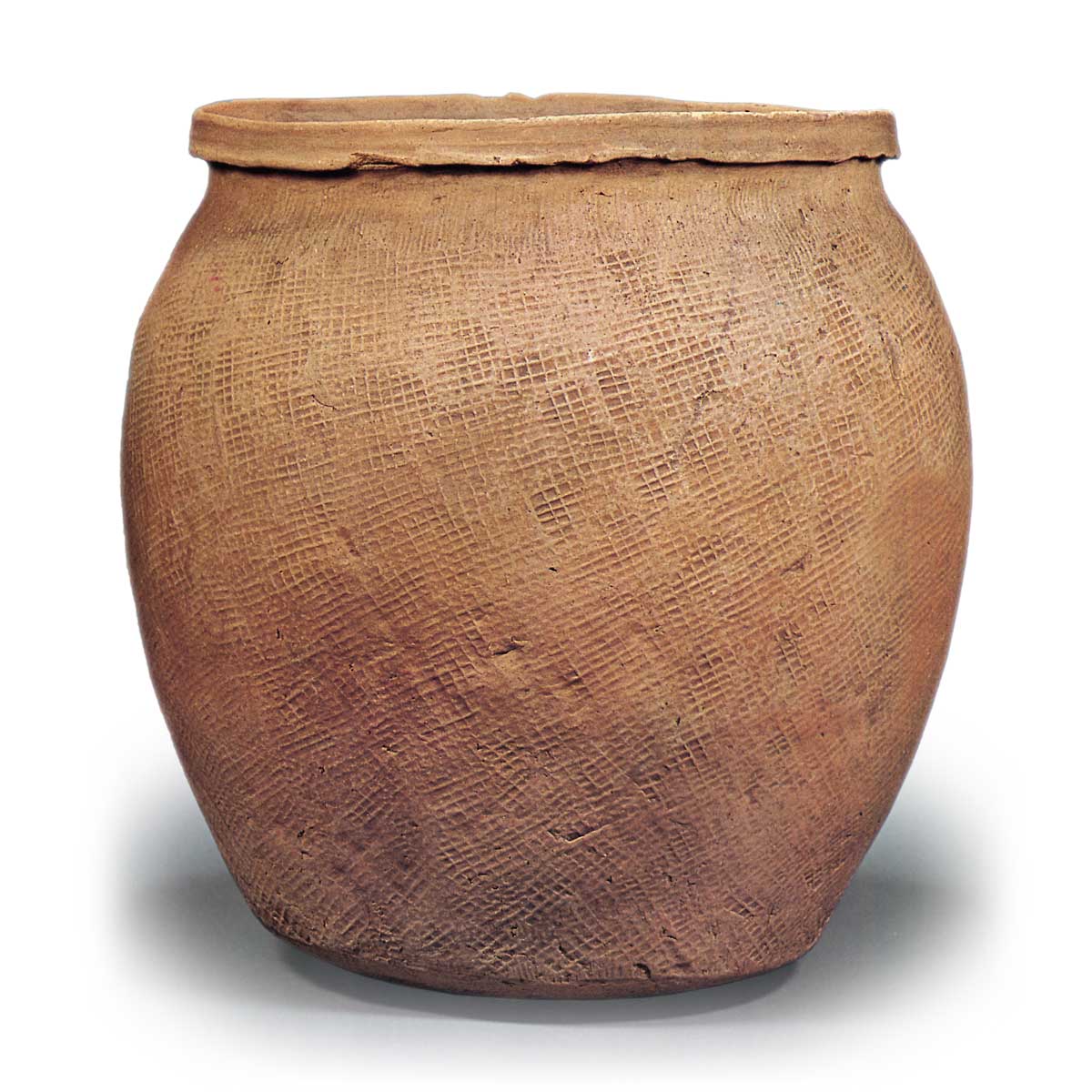 亀山大甕 日本亀山大甕 2025.05.16 亀山大甕 广岛县福山市本庄出土14世纪高度54.3厘米,口径43.8厘米,胴径52.0厘米,底径33.5厘米福山城博物馆这是龟山大瓮中为数不多的完整器物之一。烧成温度较低,呈现与土师器相似的黄白色,但并非完全烧制,而是生烧状态。 龟山大瓮的特点是胴部略微膨胀,口径与底径较大,与中世纪其他窑址的同类器物相比,具有独特的造型。底部为周缘弯曲的平底,胴部表面遍布格子状的敲打纹。口缘外侧折返的宽阔边缘可作为判断制作年代的依据。