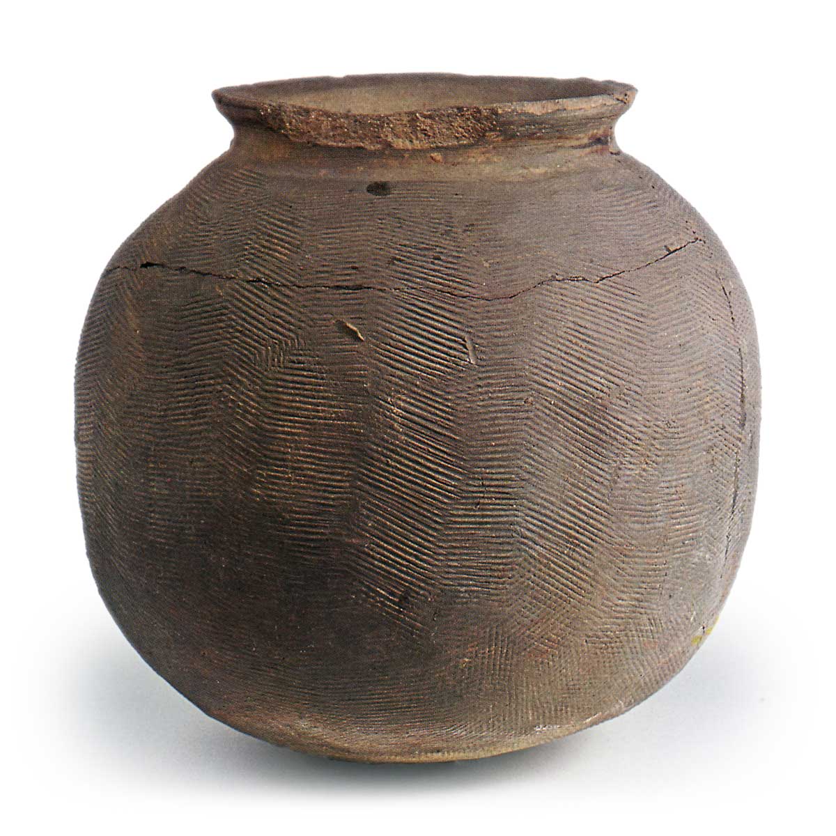 亀山壺 日本亀山壺 2025.05.16 亀山壺 广岛县福山市芦田川河床出土14世纪高度27.3厘米,口径16.7厘米,胴径27.4厘米广岛县立诚之馆高等学校胴径相对于口径较小,颈部紧凑的形状,搭配圆底球形胴体,表明了时代的演进。 同时,器面饰有条状纹饰,并以綾杉状的敲击纹压印。内面则以数条直线为单位的敲击纹装饰。此外,器面垂直方向的倒角处理等细节,与珠洲地区的成形技法极为相似。烧成温度较高,呈灰白色,烧结紧密。