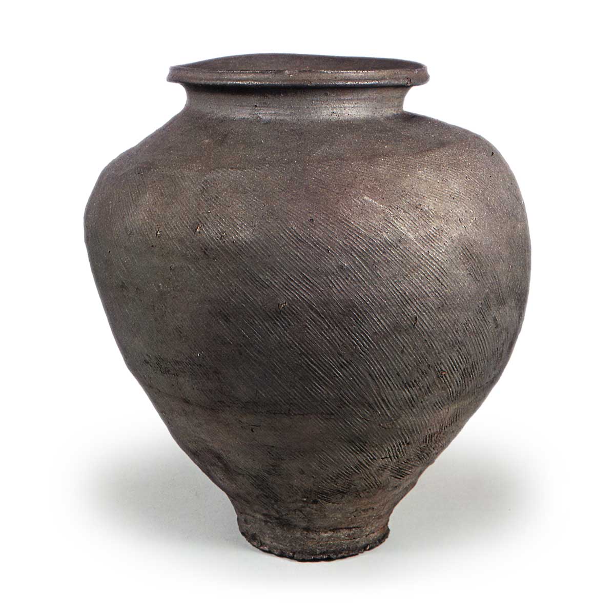 珠洲壺 日本珠洲壺 X Facebook Hatena Bookmark LINE Pinterest 复制 2025.05.16 珠洲壺 新潟县中颈城郡关山村关山神社经塚出土13世纪 高39.0厘米 口径19.5厘米 胴径34.8厘米 底径12.0厘米东京国立博物馆口颈部外翻的先端加厚,形成内弯的宽1.2厘米的边缘带,这种口部造型保留了须恵器的手法。 结合肩部外张、底部较小的胴形,可将此壶归为镰仓时代初期的作品。成形手法与珠洲完全相同,但从口部造型和陶土质地来看,难以断定为珠洲本品,故归类为珠洲系。烧制极为紧密,肩部附有薄薄的自然釉。肩部刻有“大”字。