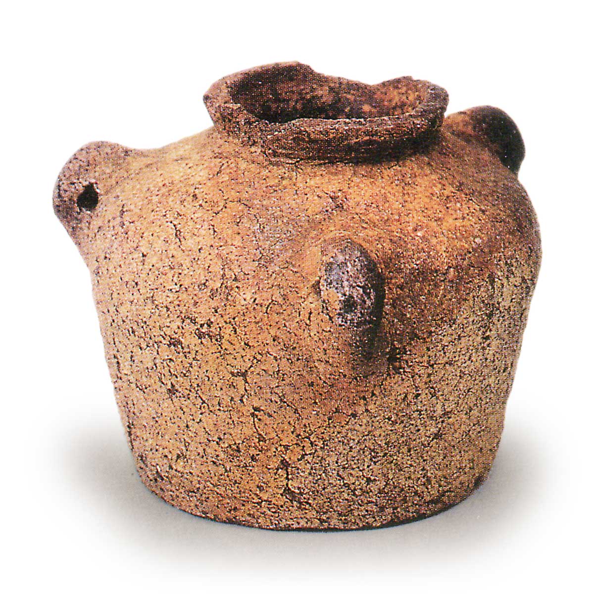信楽三耳壺 信楽備前丹波信楽三耳壺 2025.05.16 信楽三耳壺 16 世纪。高 10.3 厘米,口径 6.4 厘米,身径 12.2 厘米,底径 9.8 厘米。短外忌口颈的顶部有一个倾斜的平缘。 肩部绷紧但呈圆形,不再有棱角。 粘土富含石英岩,非常厚实。 器物烧制略显不足,表面泛白,有一些淡淡的火烧色。 肩部有三个粗大的竖耳。 带耳的信乐瓶非常罕见,可能是作为花瓶制作的。 口沿有多处缺损,不清楚是否为单口。
