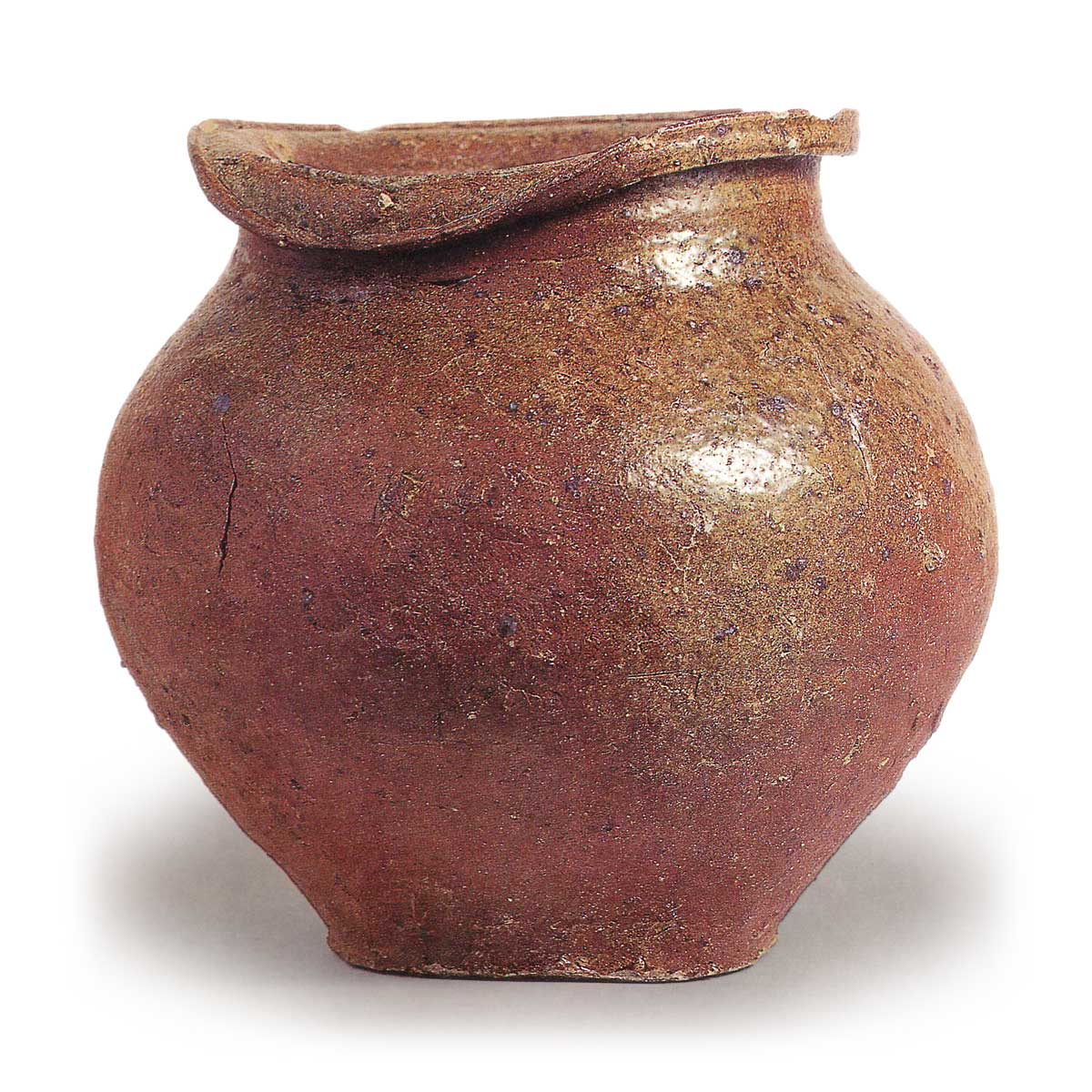 在伊贺,还没有发现比位于滋贺县边界、镰仓时代末期的五之木窑更早的窑炉。 尽管如此,我们还是可以根据罐子的泥质和成型技术推断出它出自伊贺窑。 这个中型罐子乍一看很像一个古老的东名罐,但从口颈的形状来看,显然是受东名罐的影响而制造的。 粘土的含铁量很高,并含有细小的长石颗粒,整个器皿表面似乎都布满了小铁粒熔入粘土而形成的黑色斑点。 口沿向后折叠成 “N ”形。 造型采用七段式萩烧法,器身中部从上往下磨平,在器身下半部与器身的连接处上方形成波浪状的凸起,这是伊贺独有的技术。 罐子烧制得非常好,从口沿到罐身半部都覆盖着深绿色的天然釉。 这是目前所知最古老的伊贺罐之一,出土于屠苏道寺。
