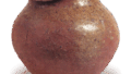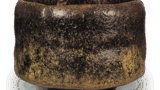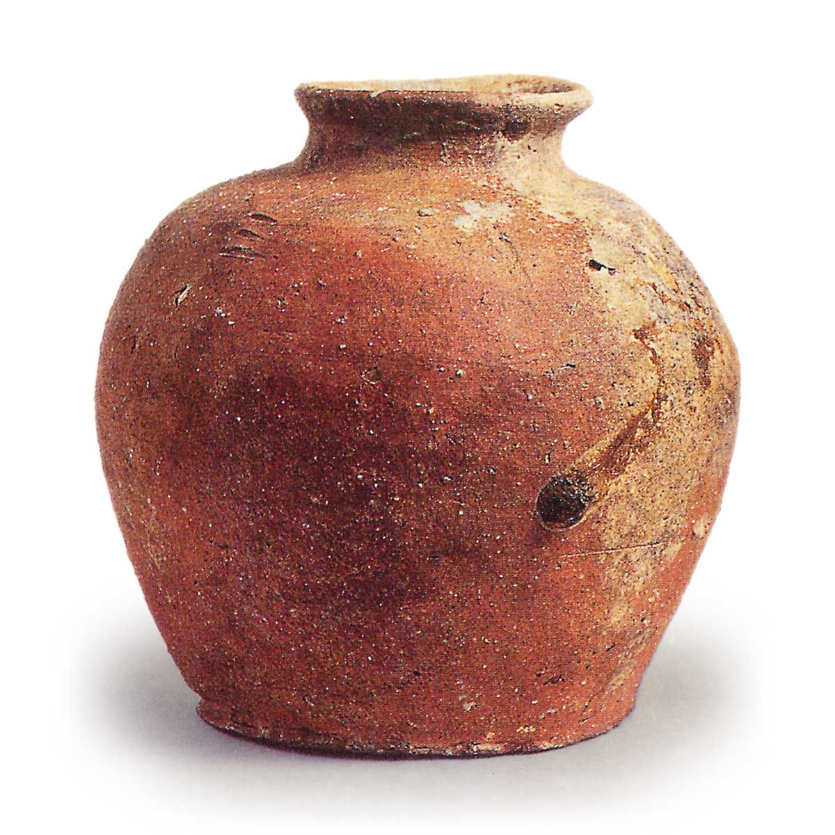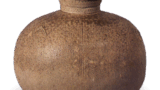 伊賀壺 信楽備前丹波伊賀壺 2025.05.19 伊賀壺 15 世纪。高 17.7 厘米,口直径 8.3 厘米,身直径 17.7 厘米,底直径 12.0 厘米。这个小罐子的罐身呈圆形,底大而平,很可能是一种石器。 粘土中含有许多细小的长石颗粒,经过充分烧制,呈红褐色。 器身呈五段庑殿式,器壁较厚,表面呈水平弧形。 肩部绘有三个和十个铭文。 口沿和部分器身施以后绿色天然釉,部分釉料斜向流动,并在末端汇集,形成所谓的蜻蜓眼状。
