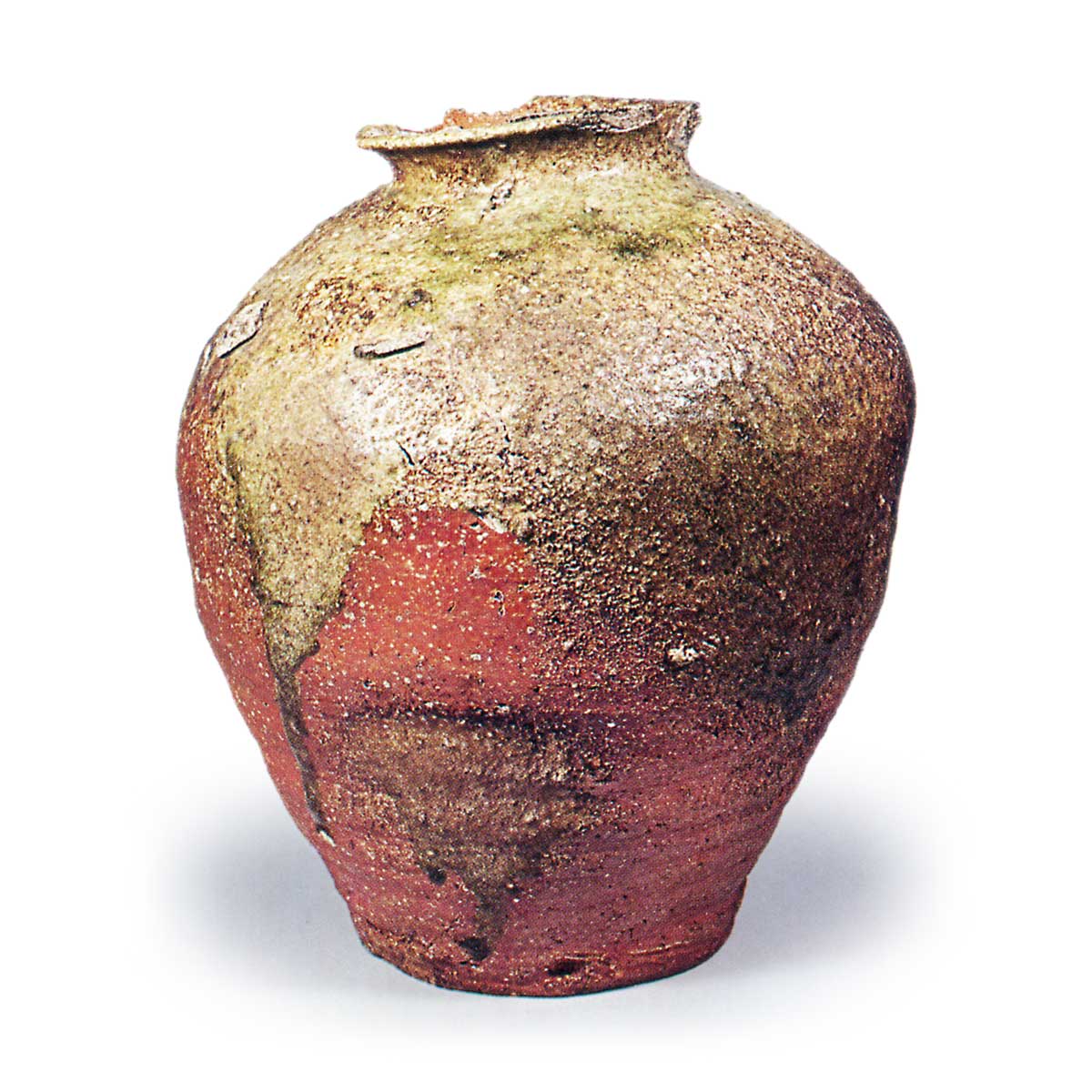 信楽壺 信楽備前丹波信楽壺 2025.05.19 信楽壺 14 世纪。高 33.0 厘米、口径 14.2 厘米、身径 29.2 厘米、底径 14.2 厘米。出光艺术博物馆这件所谓的 “反口 ”花瓶的外表面短而忌讳,肩颈连接处平缓,外观陈旧。 烧制精良的红褐色,带有明显的石英长石喷砂,肩部的浅绿色天然釉一直流淌到器身的下半部分,使得此瓶显得与众不同。