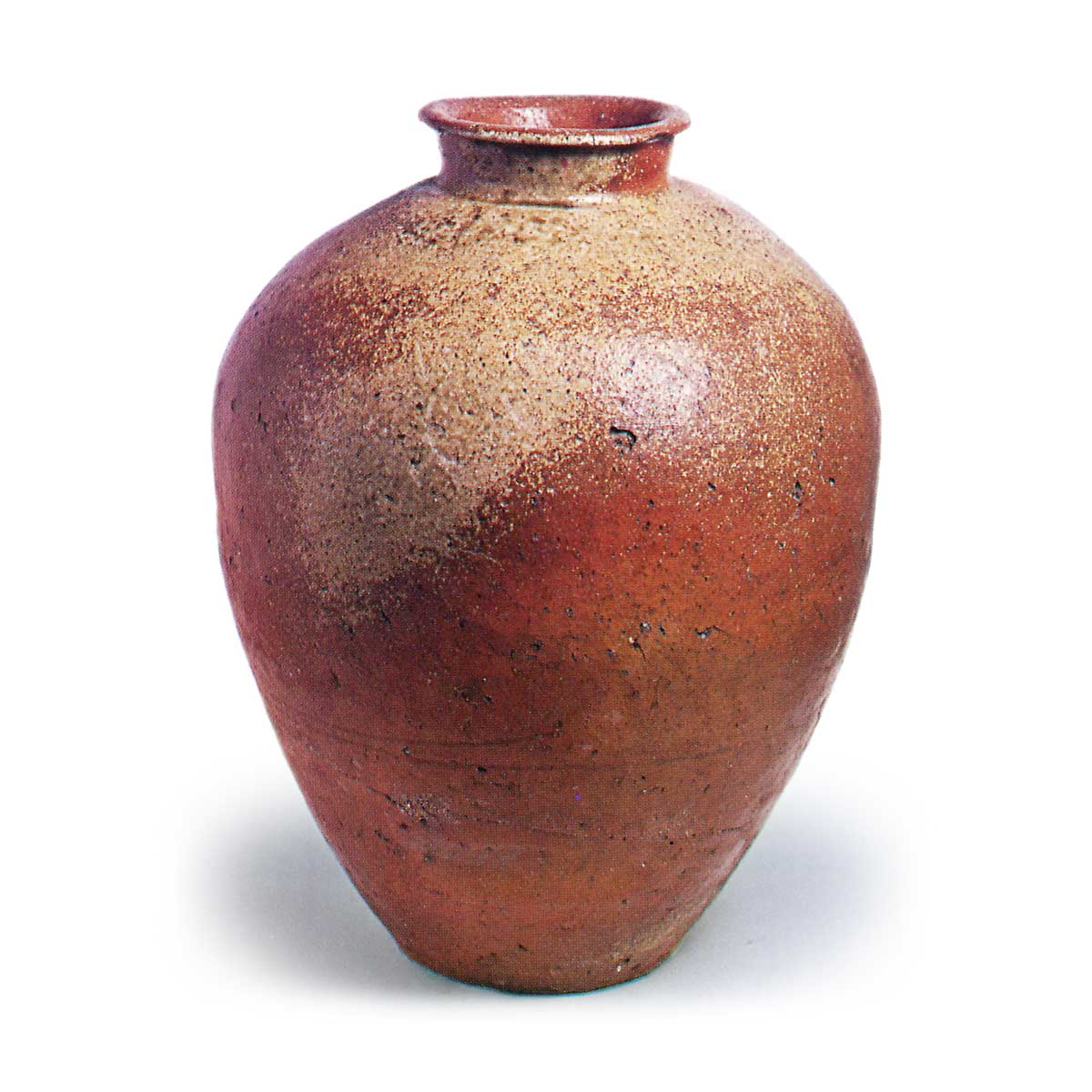 信楽壺 信楽備前丹波信楽壺 2025.05.19 信楽壺 16 世纪。高 51.3 厘米,口直径 16.0 厘米,身直径 39.8 厘米,底直径 17.5 厘米。本田收藏。小而直立的口部和颈部、整齐的卵圆形器身以及向外扭曲的口沿都表明这是一件室町晚期的器物。 它由致密的粘土制成,含有少量石英和长石,粘土绳卷起成型,器物表面用我磨平。 它烧制得很好,呈红褐色,肩部和部分器身施以墨绿色的天然釉,使这件罐子更加光彩夺目。