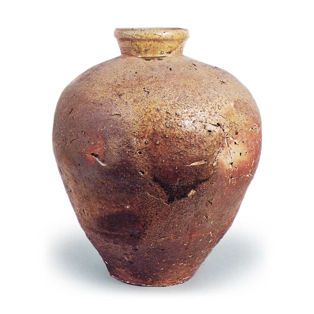 信楽壺 信楽備前丹波信楽壺 2025.05.19 信楽壺 15 世纪。高 47.7 厘米,口径 14.5-15.0 厘米,身径 39.8-41.2 厘米,底径 17.0 厘米。口颈张开,呈直立状,顶端有玉边。 肩部仍略微绷紧,表明其制作时间约在 15 世纪中叶。 棕褐色的表面上有一些黄白色和黑紫色的斑点,从口部到肩部施有黄绿色的天然釉,给人一种温暖人心的感觉。