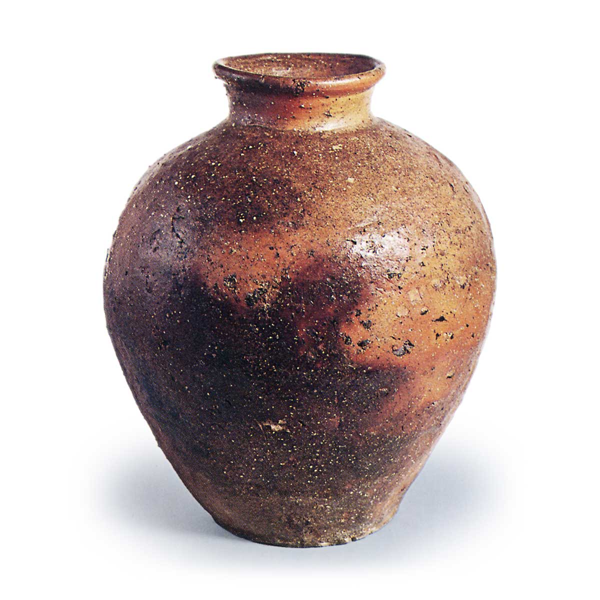 根据罐身呈卵圆形的形状推测,它大约制作于 15 世纪末,细长直立的颈部顶端明显形成一个球形边缘。 底部有明显的 “Geta ”印记。 该器物烧制良好,表面一半呈浅红色,一半呈黑色,烧制不均匀,肩部有黄绿色的自然釉,使其色调多变。