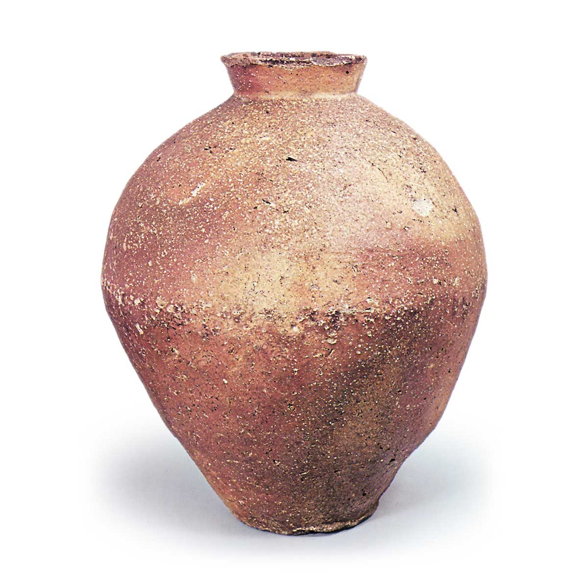 信楽壺 信楽備前丹波信楽壺 2025.05.19 信楽壺 15 世纪。高 49.0 厘米,口径 12.8 厘米,身径 39.5 厘米,底径 15.3 厘米。这件大罐的口颈末端有一个平边的尖端,外侧直立。 罐身形状保留了算术球的形式,但肩部相当圆润,据认为制作于 15 世纪。 器身采用绳状粘土卷制技术,由六个关节组成。 器物烧制精良,浅红色器皮的肩部施有黄绿色芝麻洒天然釉。