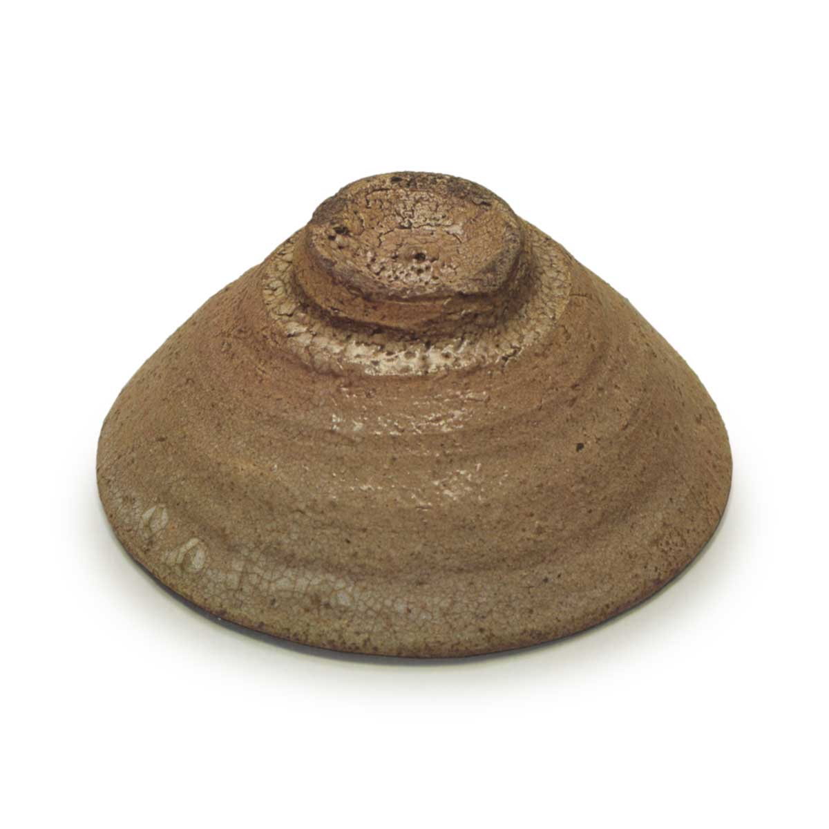 竹节高台略显宽大,器身从口边直伸而下,轆轤纹路清晰,侧边处理坚实,展现出锐利的制作手法。青井戸特有的釉面中透出枇杷色光泽,形成片身替的独特景致。 高台边缘的侧面线条尤为鲜明,口边釉料堆积处形成优美的景致,为这只茶碗增添了独特的韵味。内壁有四处凹痕。