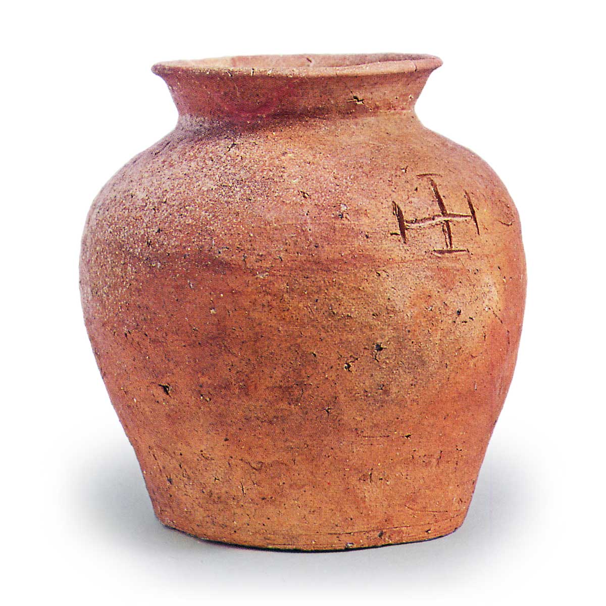 伊賀壺 信楽備前丹波伊賀壺 2025.06.12 伊賀壺 14世纪高度23.3厘米,口径14.5厘米,胴径22.2厘米,底径15.4厘米外翻的圆口宽口壶。采用含有长石微粒的陶土制成,与伊贺地区的其他陶器同质。采用绳土卷起成型,内壁沿接缝处有指压痕。器面经篾削处理并用刷子调整纹理。底面有蓆状压痕。肩部有绘制的日文字样。虽意义不明,但从尺寸来看,应非单纯的窑印。
