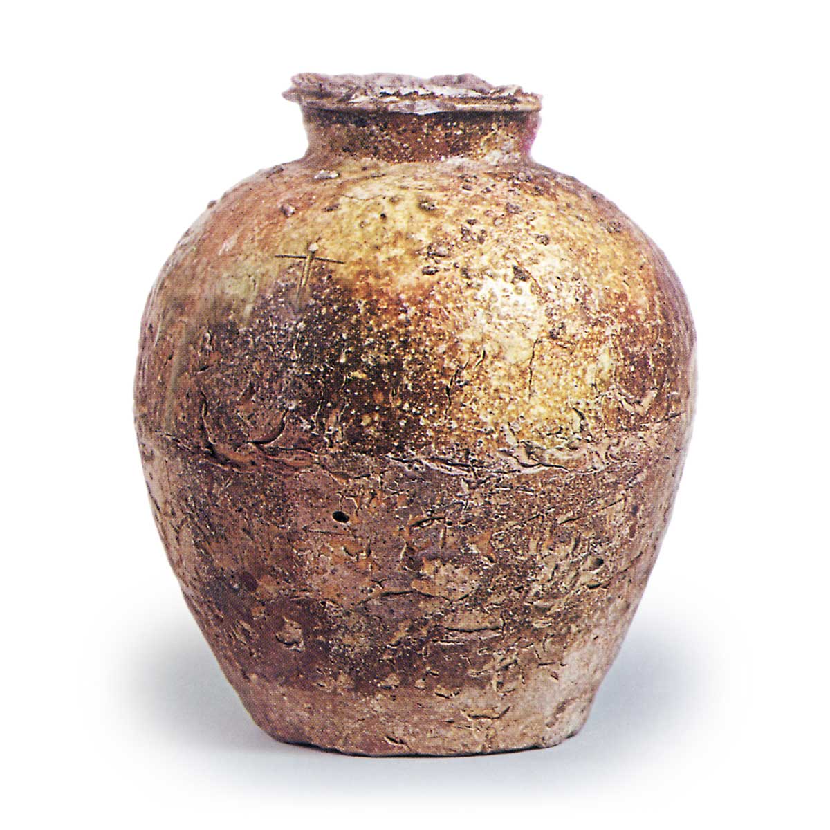 伊賀壺 信楽備前丹波伊賀壺 2025.06.12 伊賀壺 15世纪高度29.0厘米 口径11.4厘米 胴径25.0厘米 底径14.0厘米与图63的壶采用相同的制作工艺。陶土含有长石细粒,铁分含量较高。采用绳土卷起四段拼接的制作手法,胴部中央从上向下抹压陶土成形,此技法在伊贺地区尤为显著。烧成效果极佳,器面呈黑褐色,覆盖有黄绿色自然釉,边缘略带白浊。肩部有十个窑印。